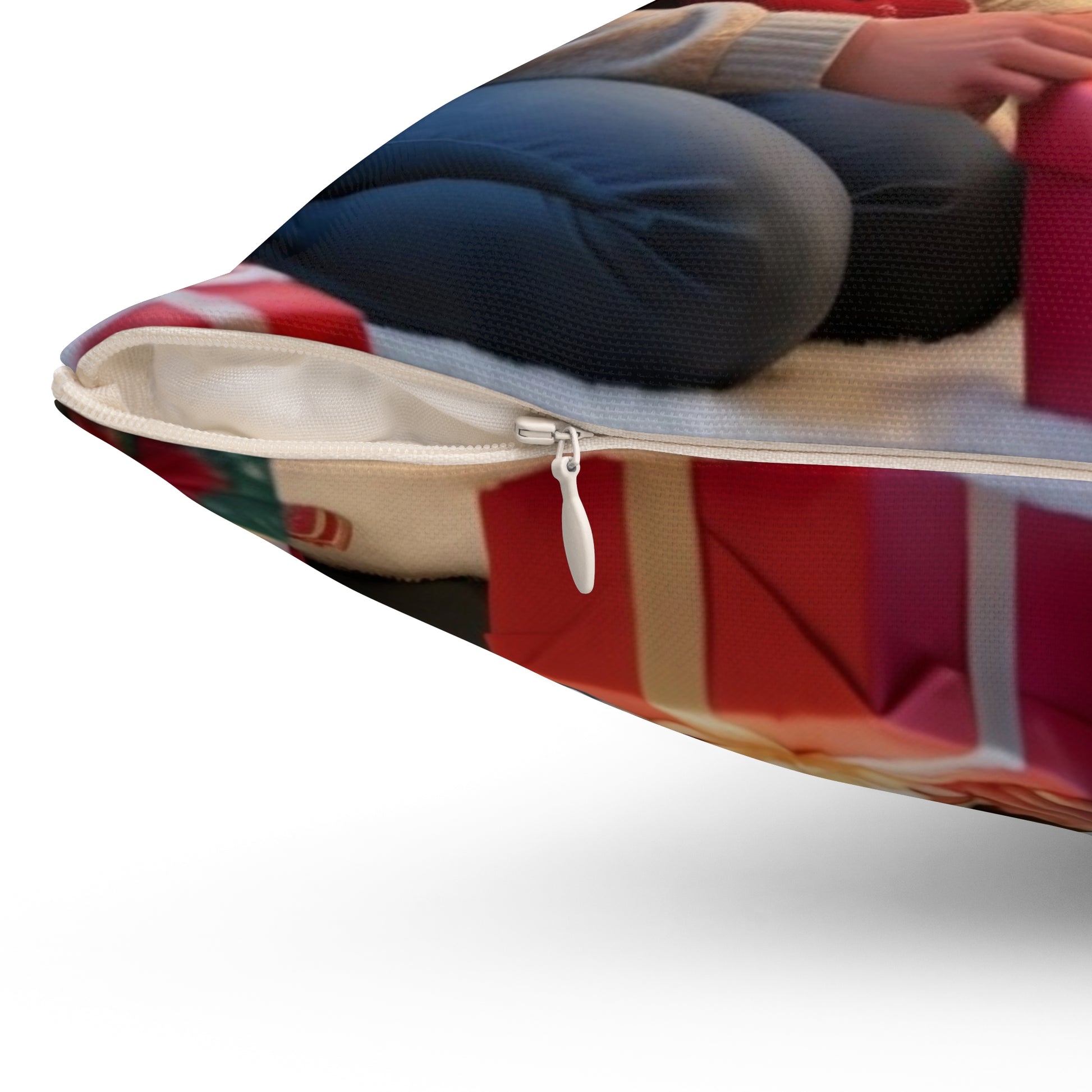 A cozy square throw pillow printed on both sides with a warm family holiday scene. Soft spun polyester keeps the image vibrant and crisp without wrinkling, while a concealed beige zipper keeps lines clean. The recycled polyester insert ships separately and is slightly oversized so once you stuff the cover it fluffs into a full, rounded cushion that invites you to sink in. Tuck it on a couch, an armchair, or a reading nook to add a gentle, homey glow for holiday evenings and seasonally decorated rooms.