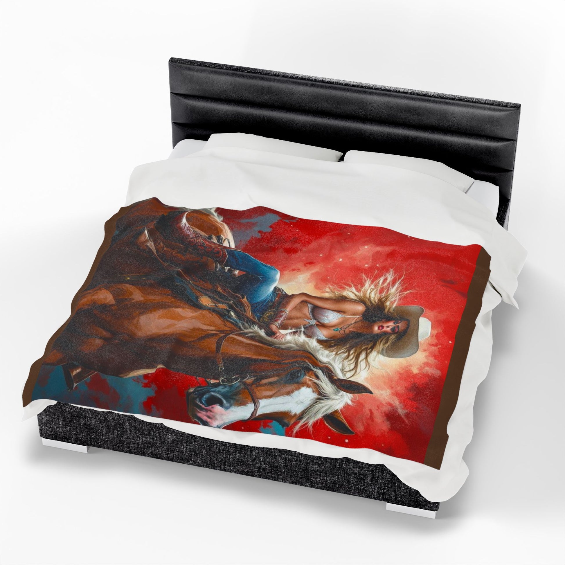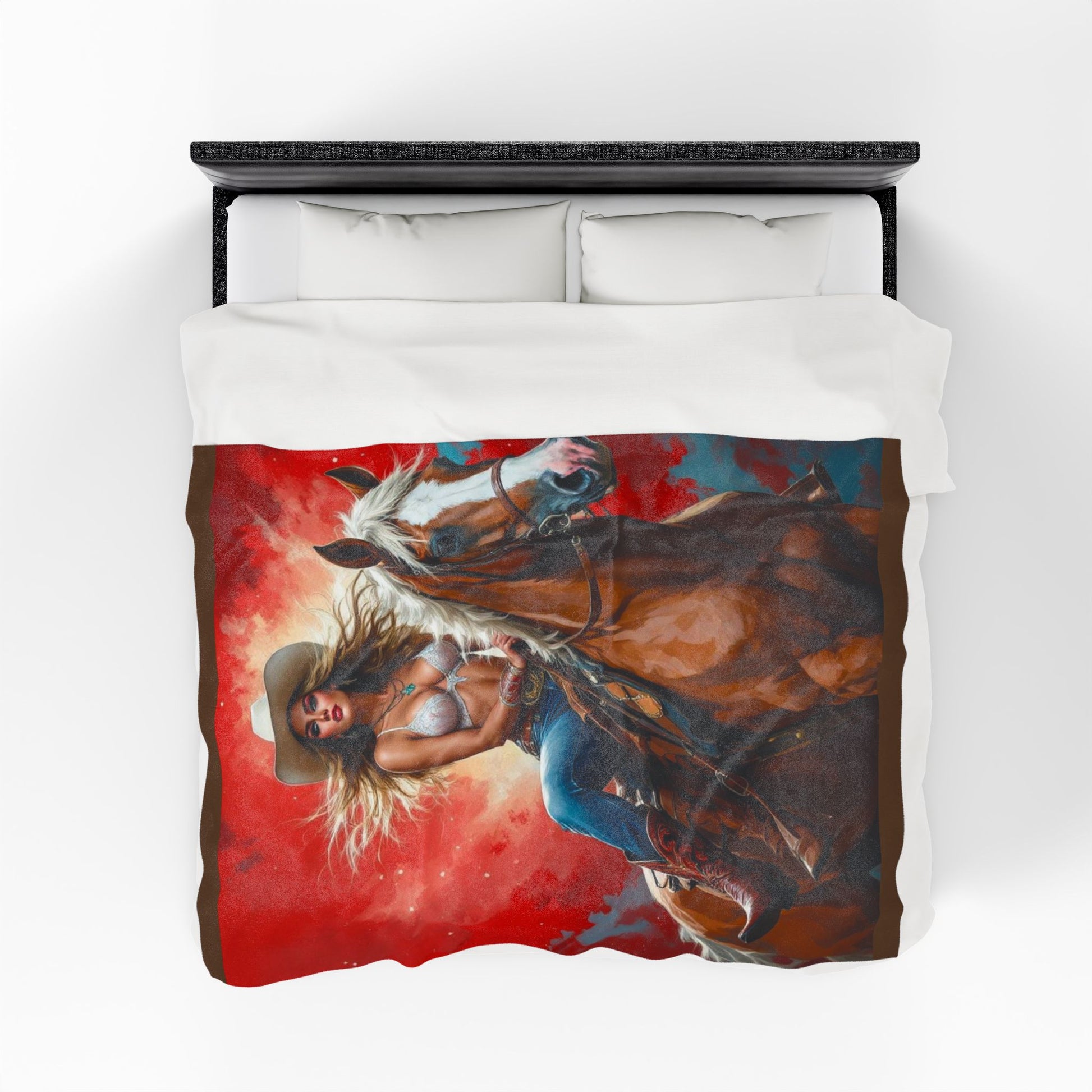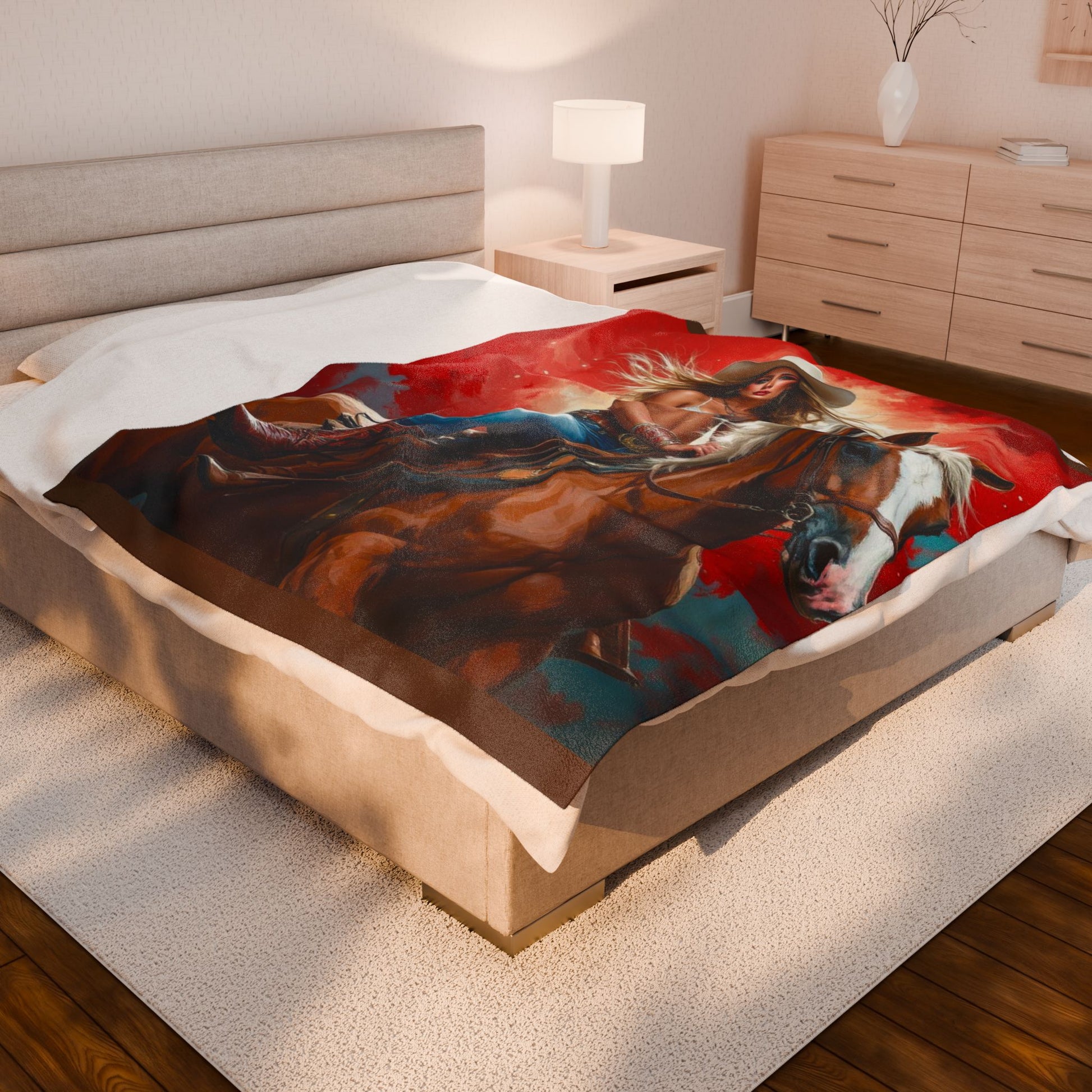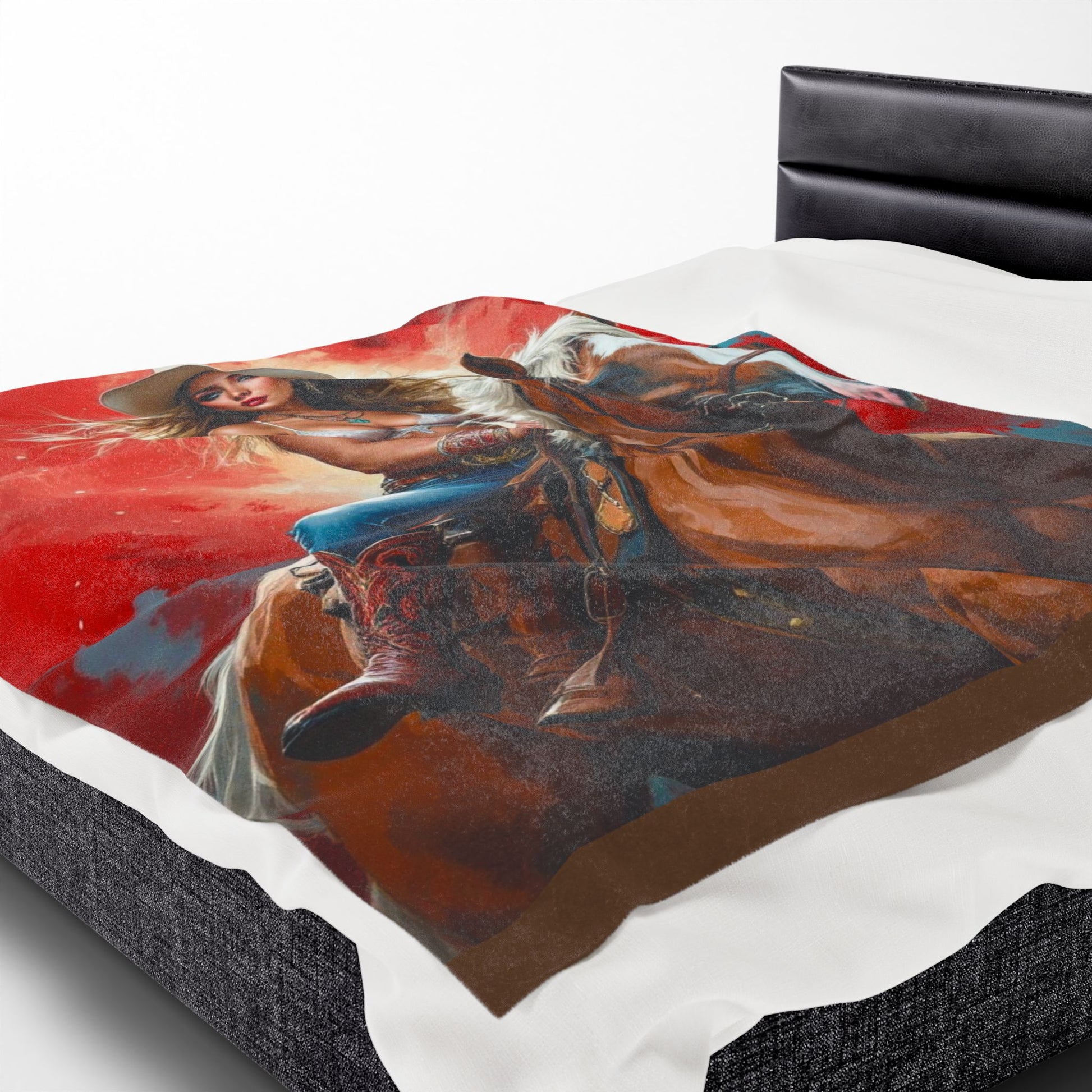 Wrap yourself in western daydreams with this velveteen plush blanket. A bold, painterly illustration of a cowgirl riding her horse fills one side with rich reds and warm earth tones, bringing a touch of rodeo flair to quiet evenings on the couch. The fabric is sumptuously soft against the skin and holds vibrant, high-detail print so the scene reads clearly whether draped over a chair or spread across the foot of a bed. It’s made to be lived in — durable double-stitched edges and a medium-heavy weight give it substance without feeling cumbersome. Use it to add a statement layer to your rustic living room, to cozy up after a long day at the barn, or to evoke that wide-open-sky feeling when you need a little escape.