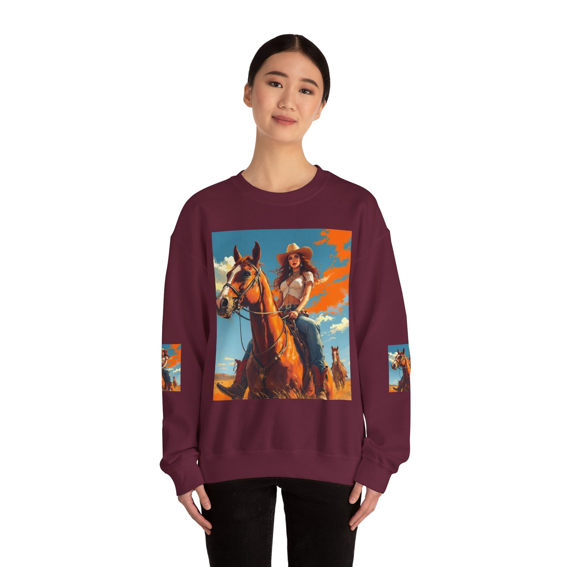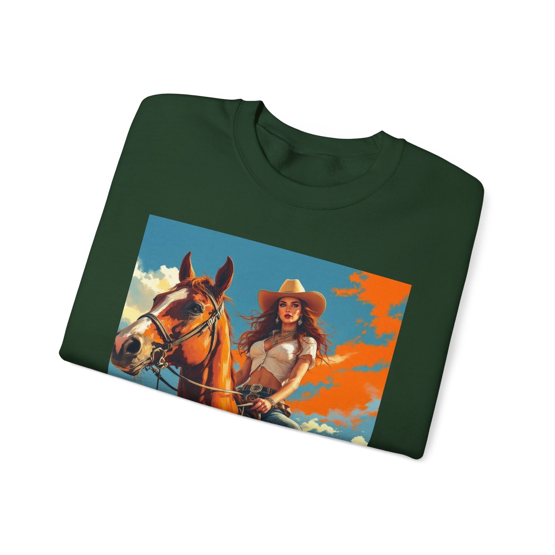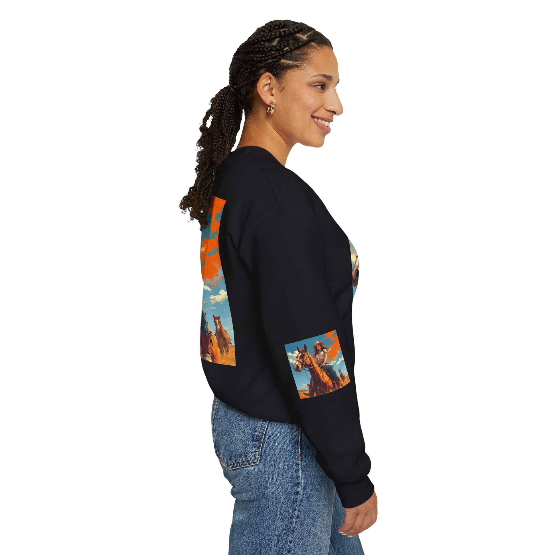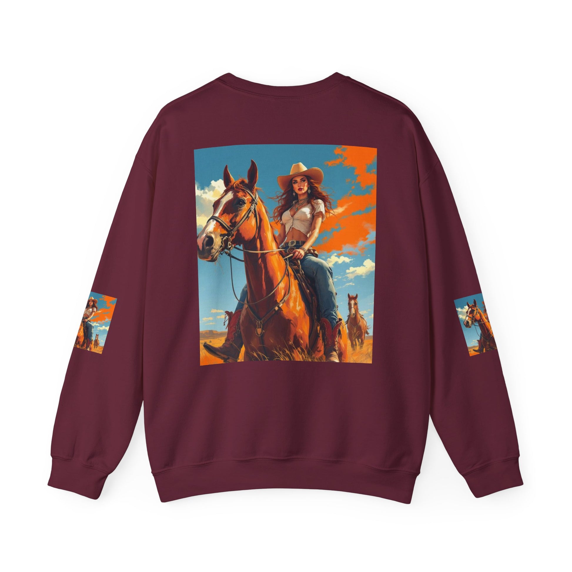 This crewneck sweatshirt carries a sunlit western scene — a confident cowgirl on horseback beneath a wide sky — printed boldly across the front, back, and sleeves. The medium-heavy cotton-poly blend gives the piece a structured, cozy feel that wears like a lived-in favorite. Double-needle stitching and ribbed collar keep the silhouette clean and durable, while tear-away neck labels remove scratchiness. The printed art brings a warm, adventurous mood to everyday layers, whether you wear it around town or on weekend drives out of the city.