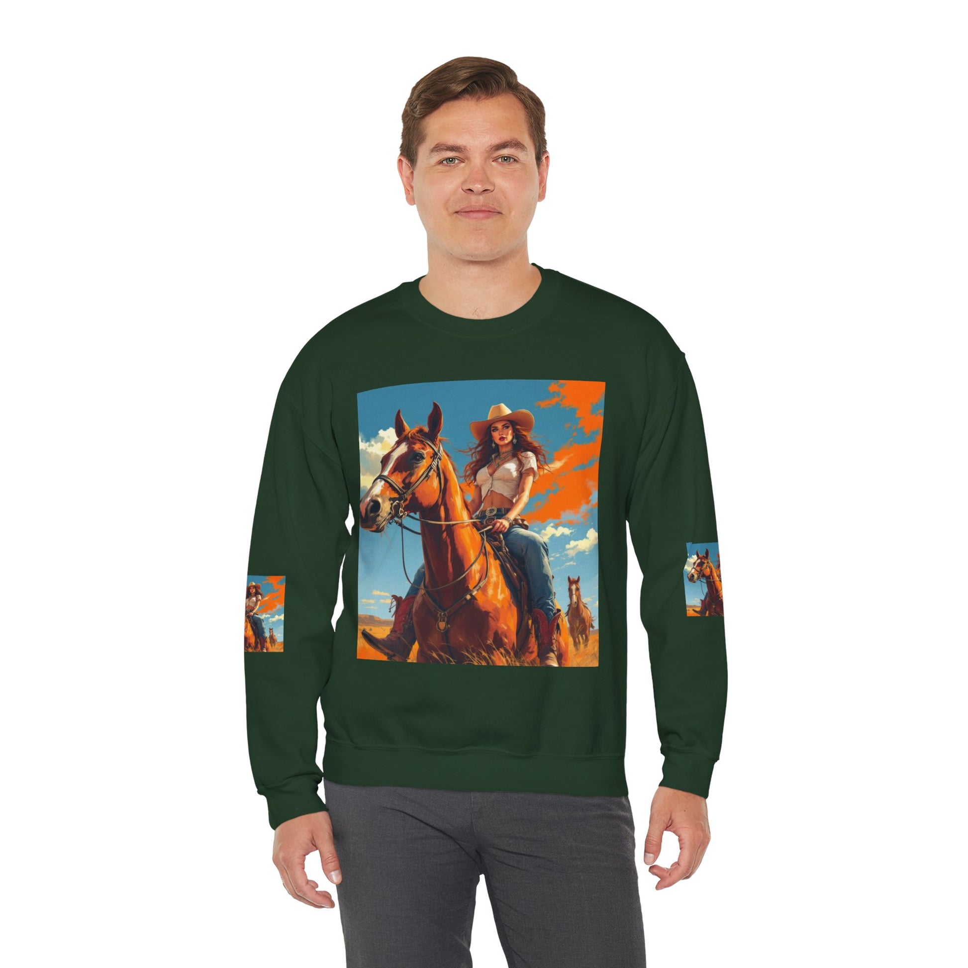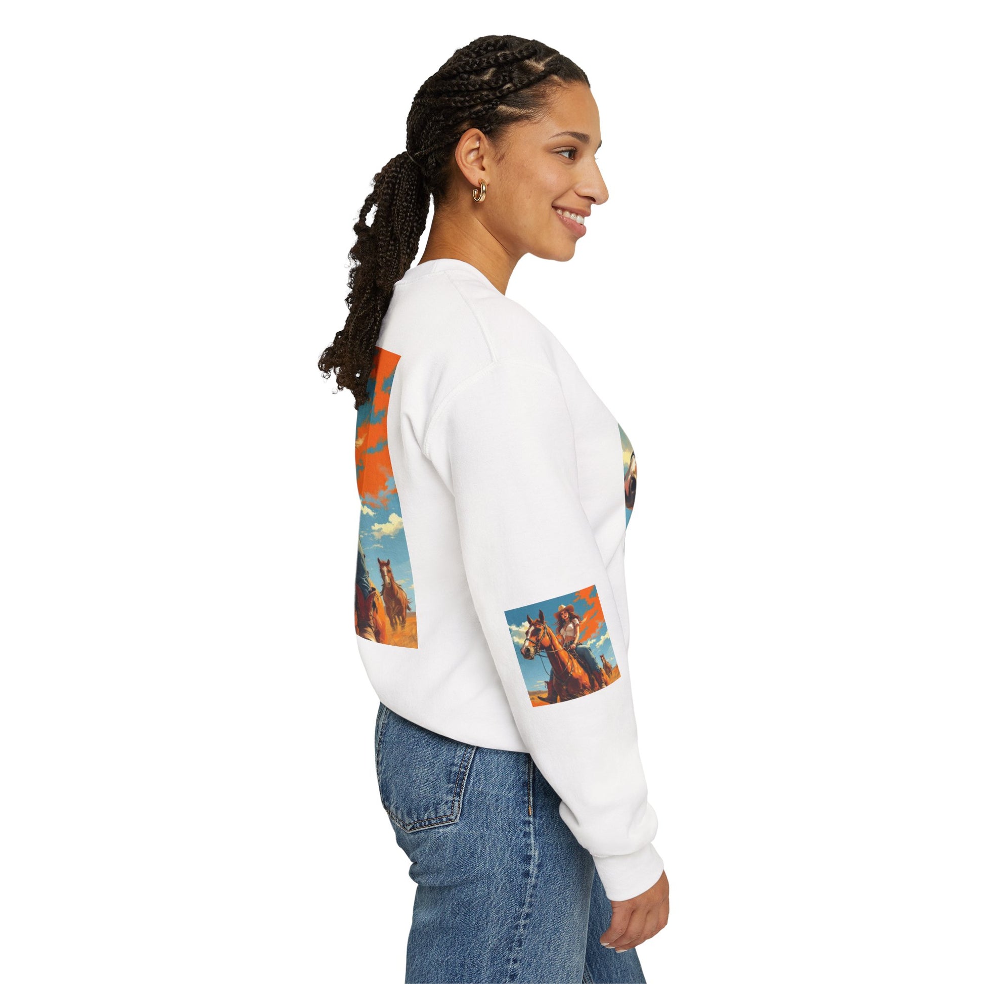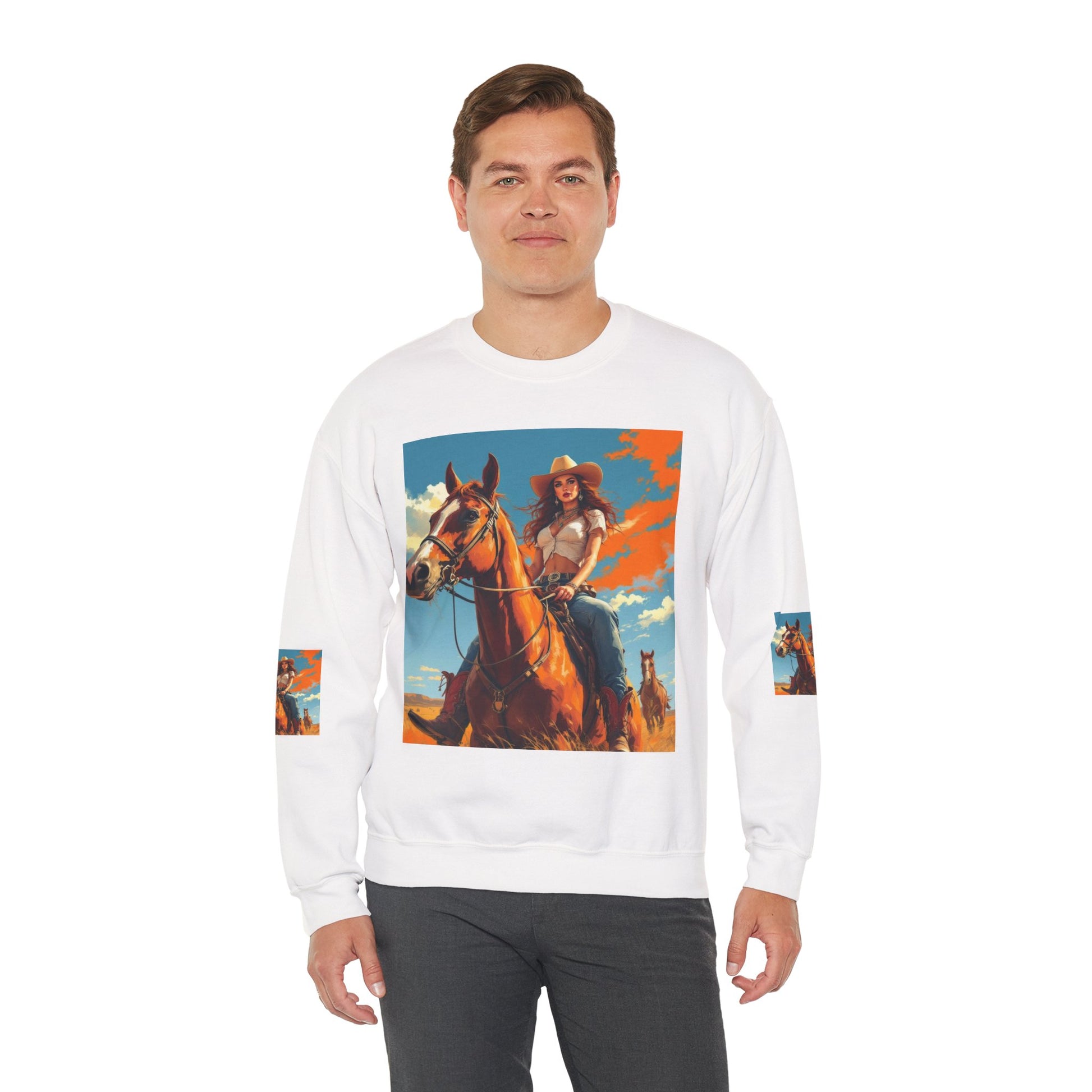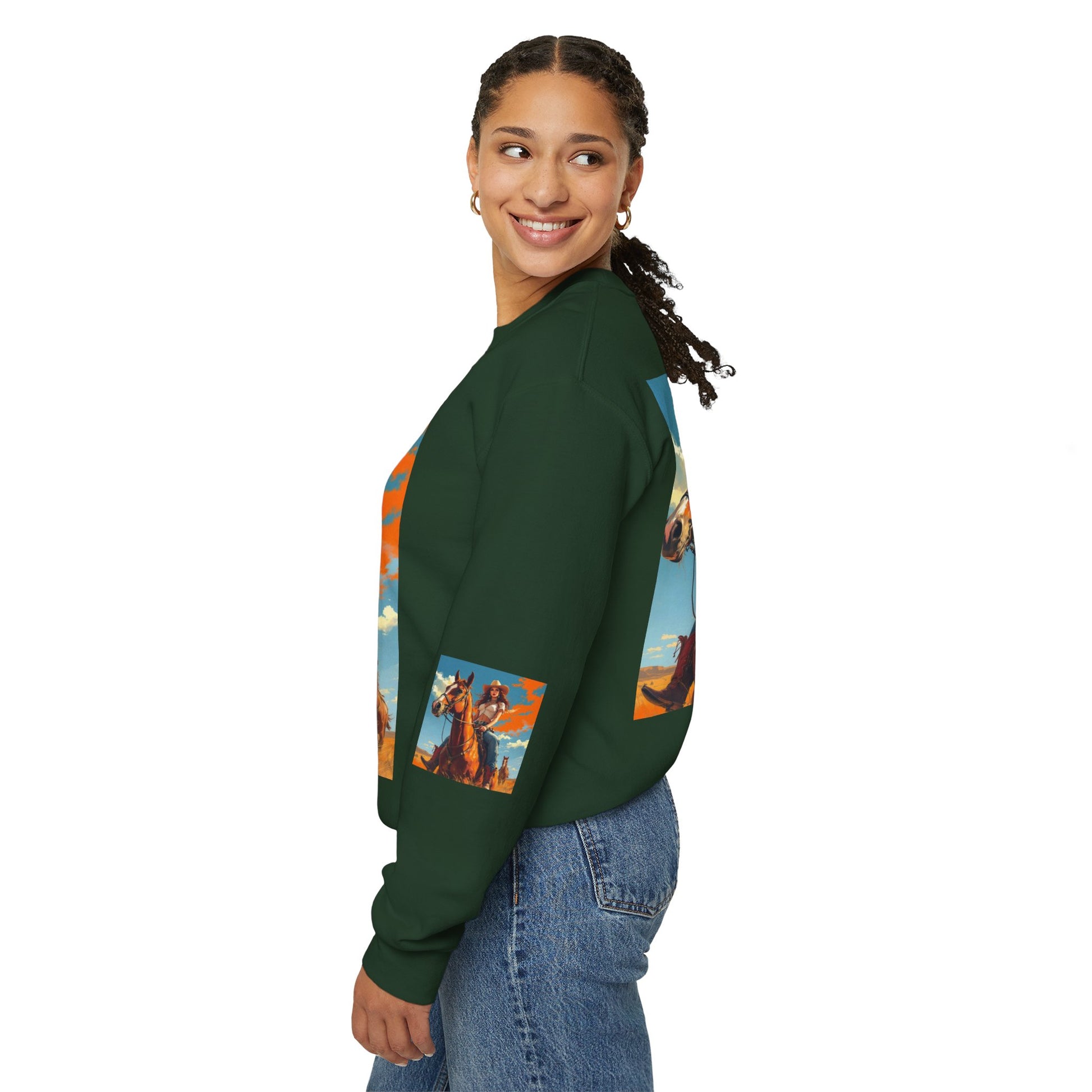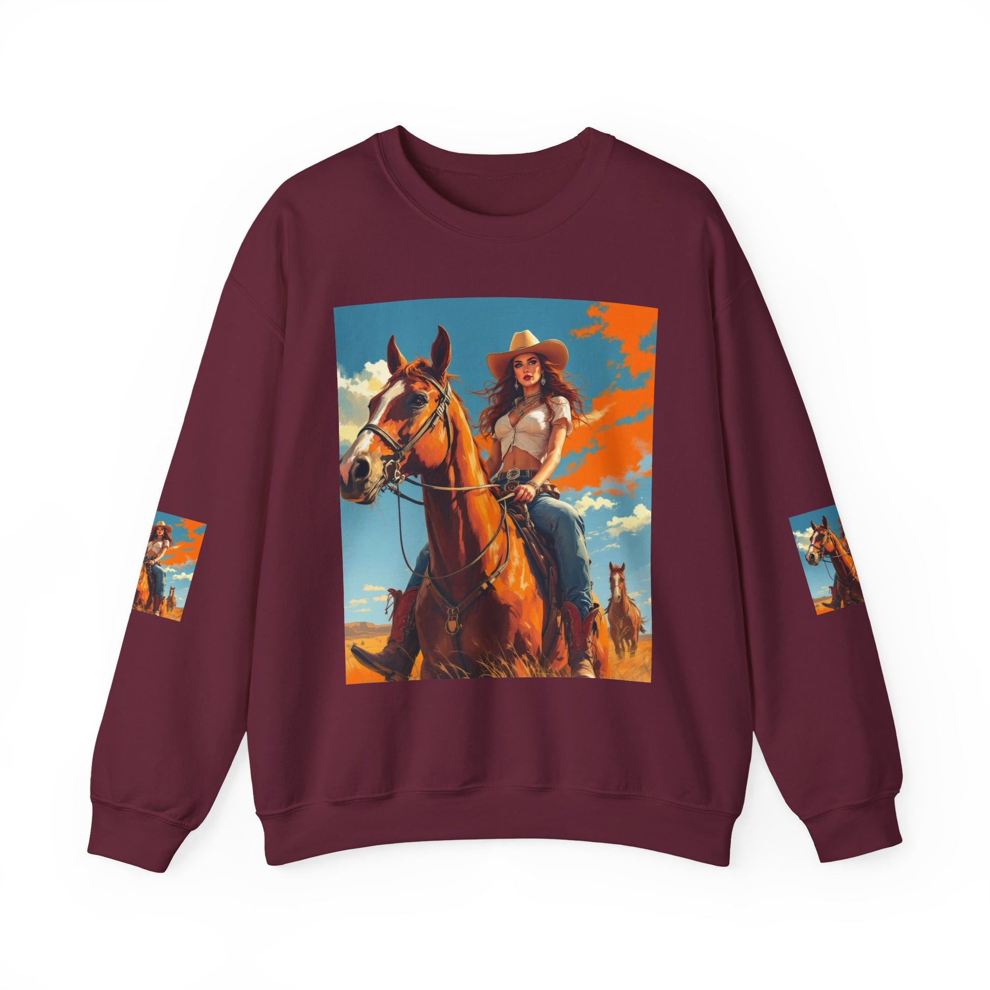 This crewneck sweatshirt carries a sunlit western scene — a confident cowgirl on horseback beneath a wide sky — printed boldly across the front, back, and sleeves. The medium-heavy cotton-poly blend gives the piece a structured, cozy feel that wears like a lived-in favorite. Double-needle stitching and ribbed collar keep the silhouette clean and durable, while tear-away neck labels remove scratchiness. The printed art brings a warm, adventurous mood to everyday layers, whether you wear it around town or on weekend drives out of the city.