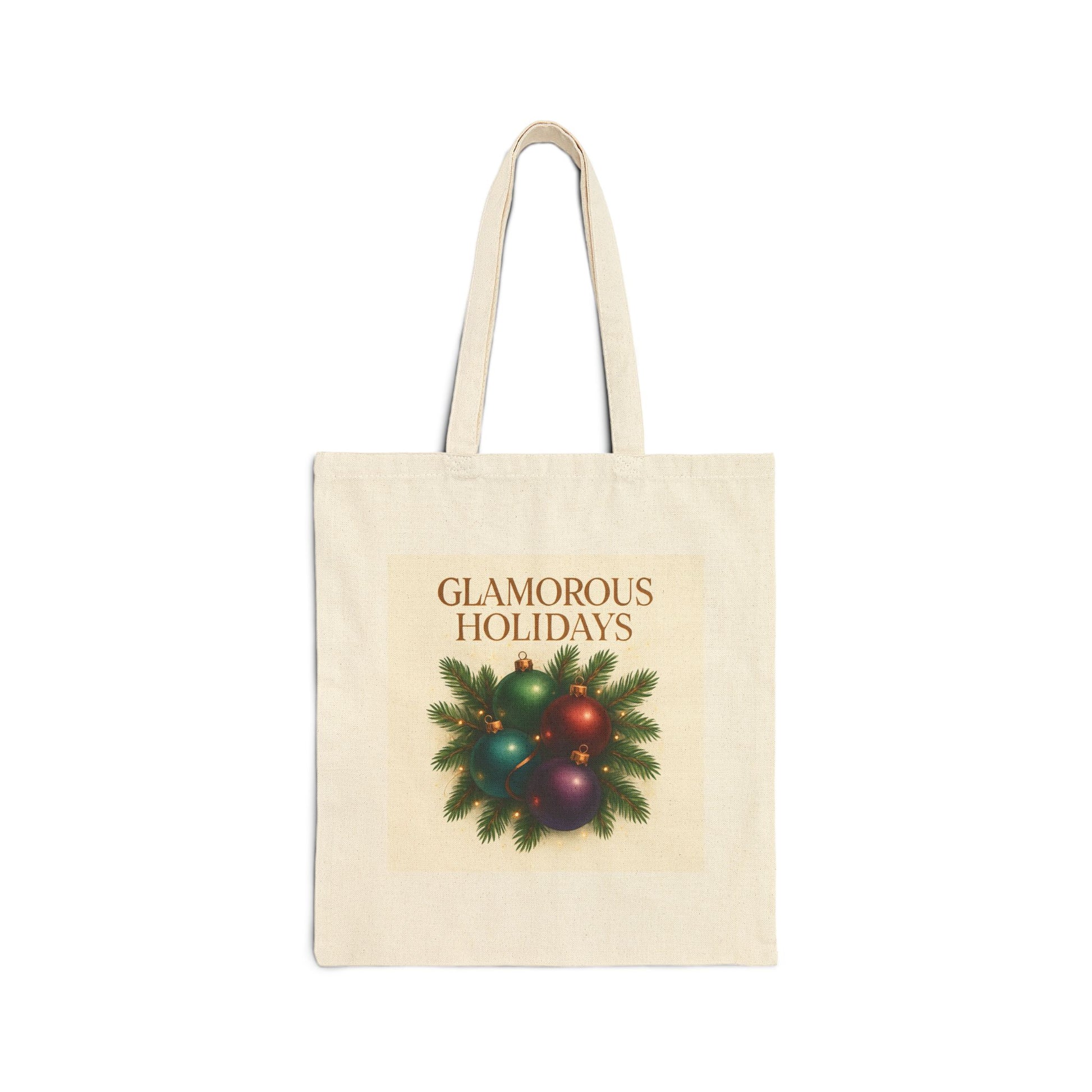 A sturdy cotton canvas tote designed to carry holiday cheer with understated elegance. The heavy 12 oz fabric and flat-corner construction create a reliable, boxy silhouette that stands up to market runs, gift wrapping, and seasonal errands. Long self-fabric handles with reinforced stitching make it easy to sling over a shoulder, while the sewn-in label and durable weave promise repeated use. The front features a festive arrangement of glossy ornaments and evergreen sprigs with a warm, vintage-inspired “GLAMOROUS HOLIDAYS” title — a subtle nod to classic seasonal style. Offered in natural and black, it blends smoothly into holiday routines and small traditions. Product features - 100% heavy-weight cotton canvas (12 oz/yd²) for durability - Flat-corner construction for a structured, roomy interior - Long self-fabric handles with reinforced stitching for secure carry - Sewn-in label; blank product sourced from India - Available in natural and black colorways Care instructions - Do not iron directly over the printed area - print may stick to the iron. - Spot clean - Do not bleach - Line dry