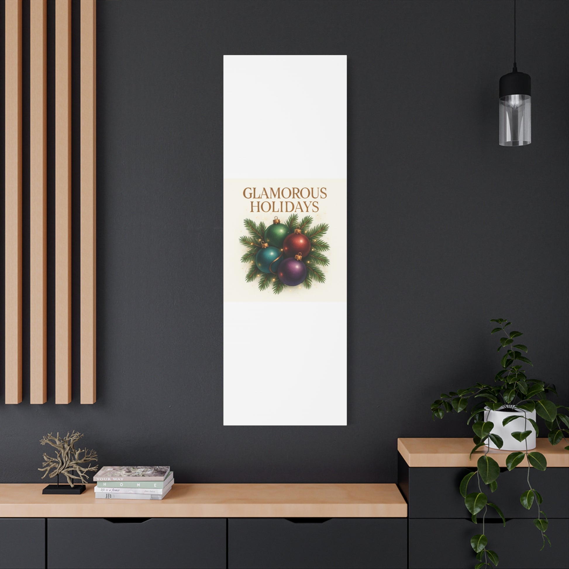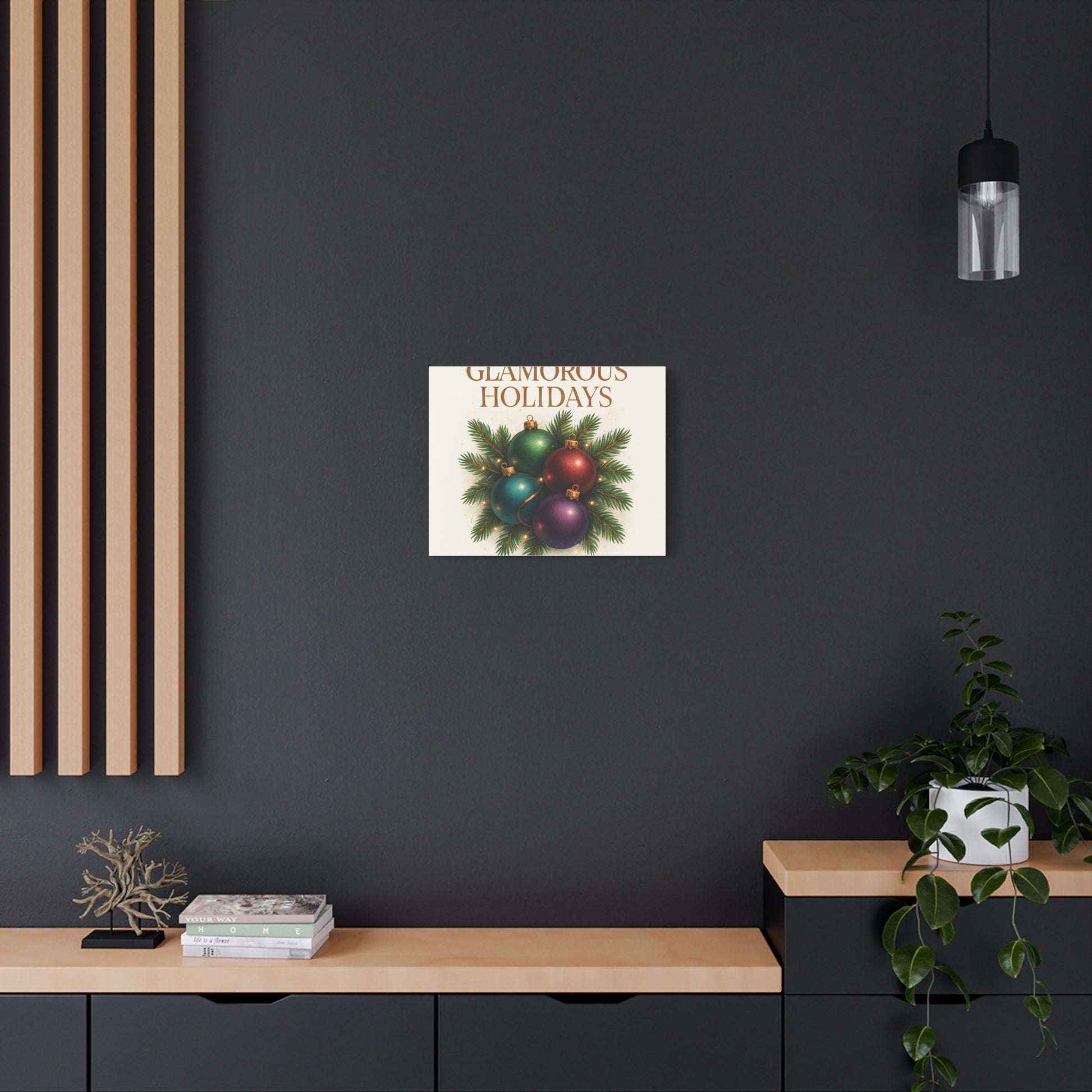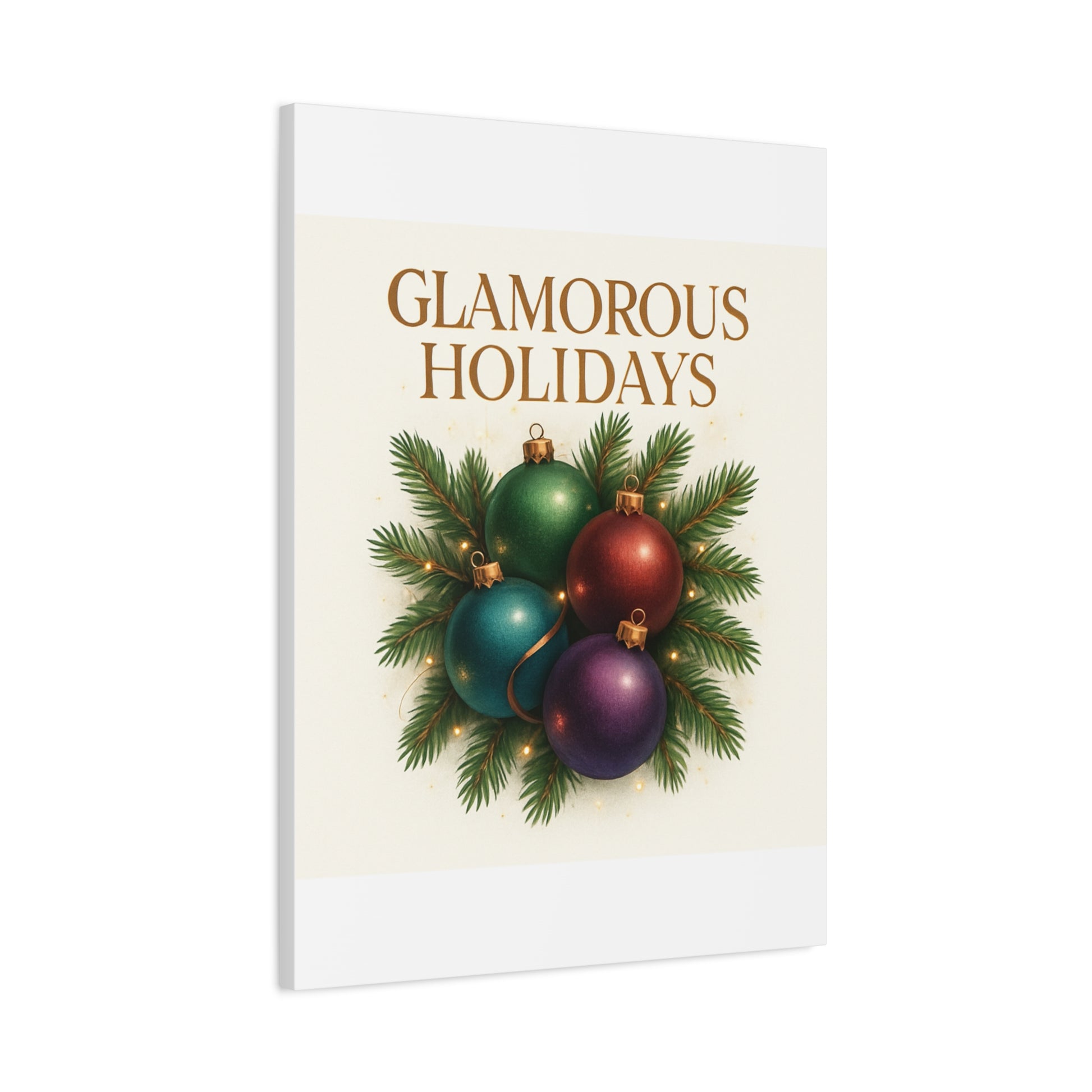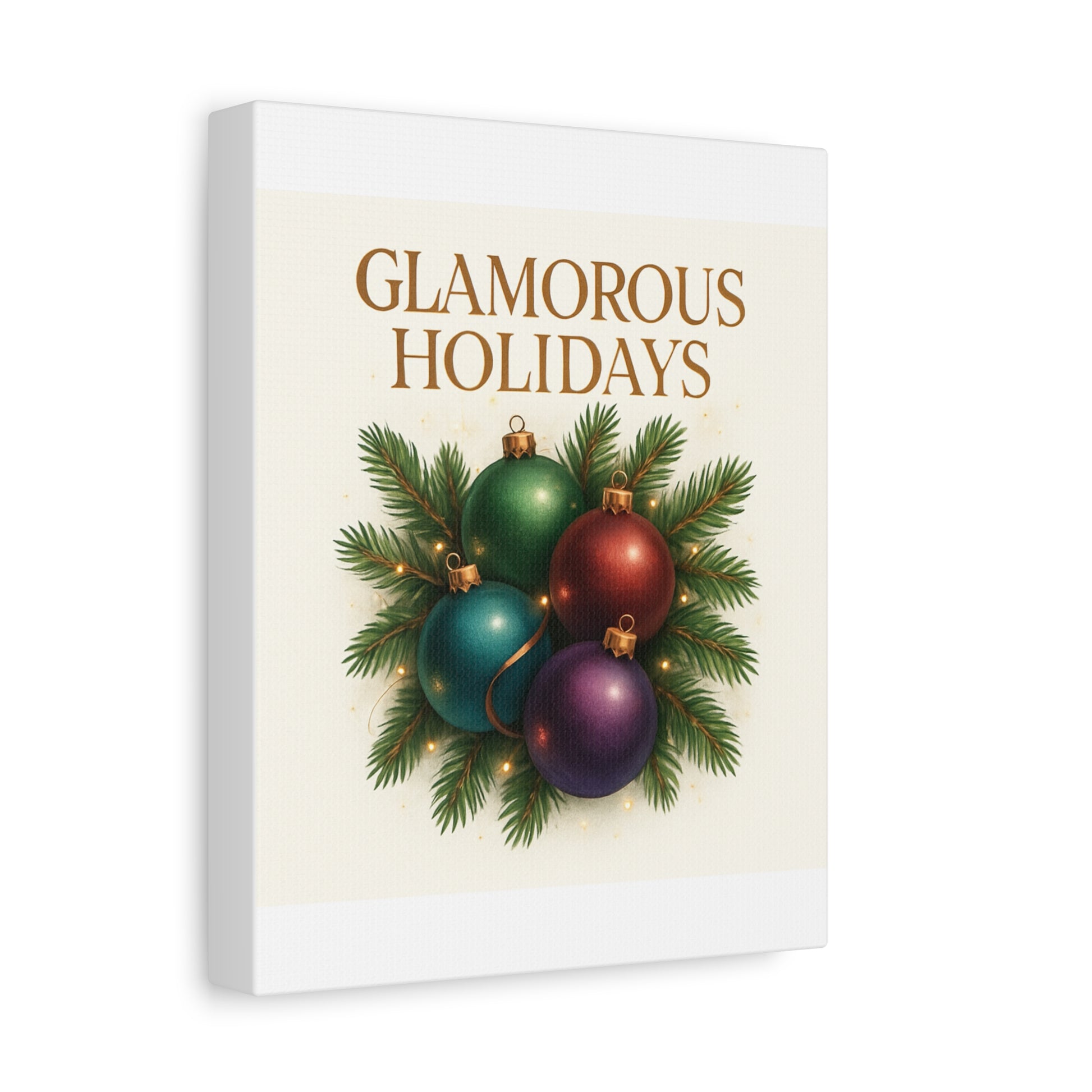 A festive matte canvas print that brings a warm, vintage holiday mood to any room. The stretched canvas features rich, jewel-toned ornaments nestled in pine sprigs with a subtle, off-white background and gold lettering that reads "GLAMOROUS HOLIDAYS." The textured cotton-poly surface and Greenguard Gold latex inks deliver vivid, lasting color while remaining non-toxic. Built on a sustainably sourced radiata pine frame and finished with soft rubber dots and back-hanging hardware, this piece arrives ready to display — horizontally, vertically, or square — and fits seasonal décor, entryways, living rooms, or holiday gallery walls with effortless charm.