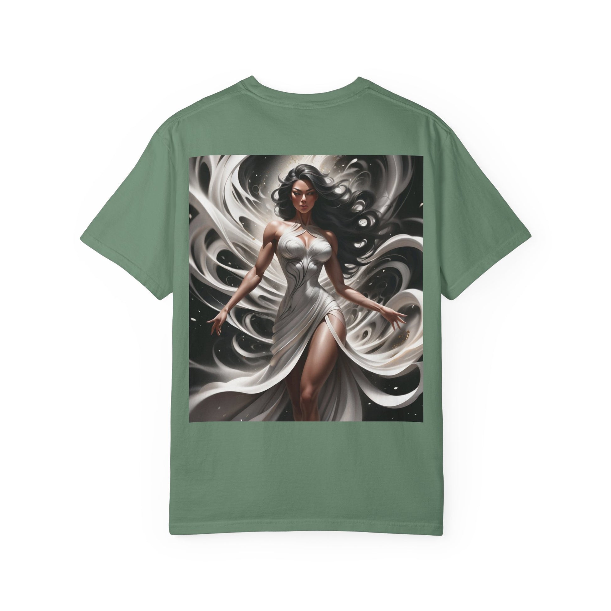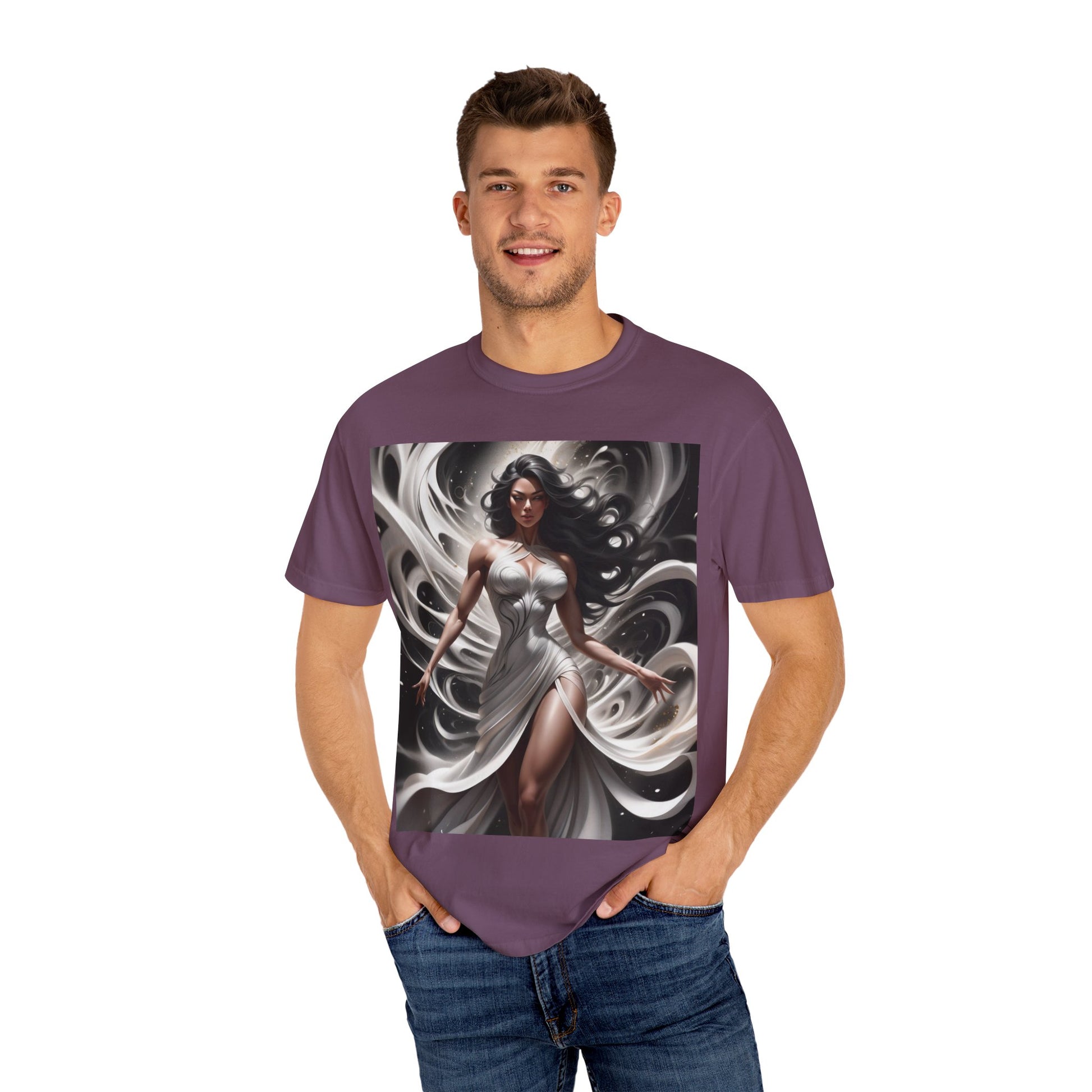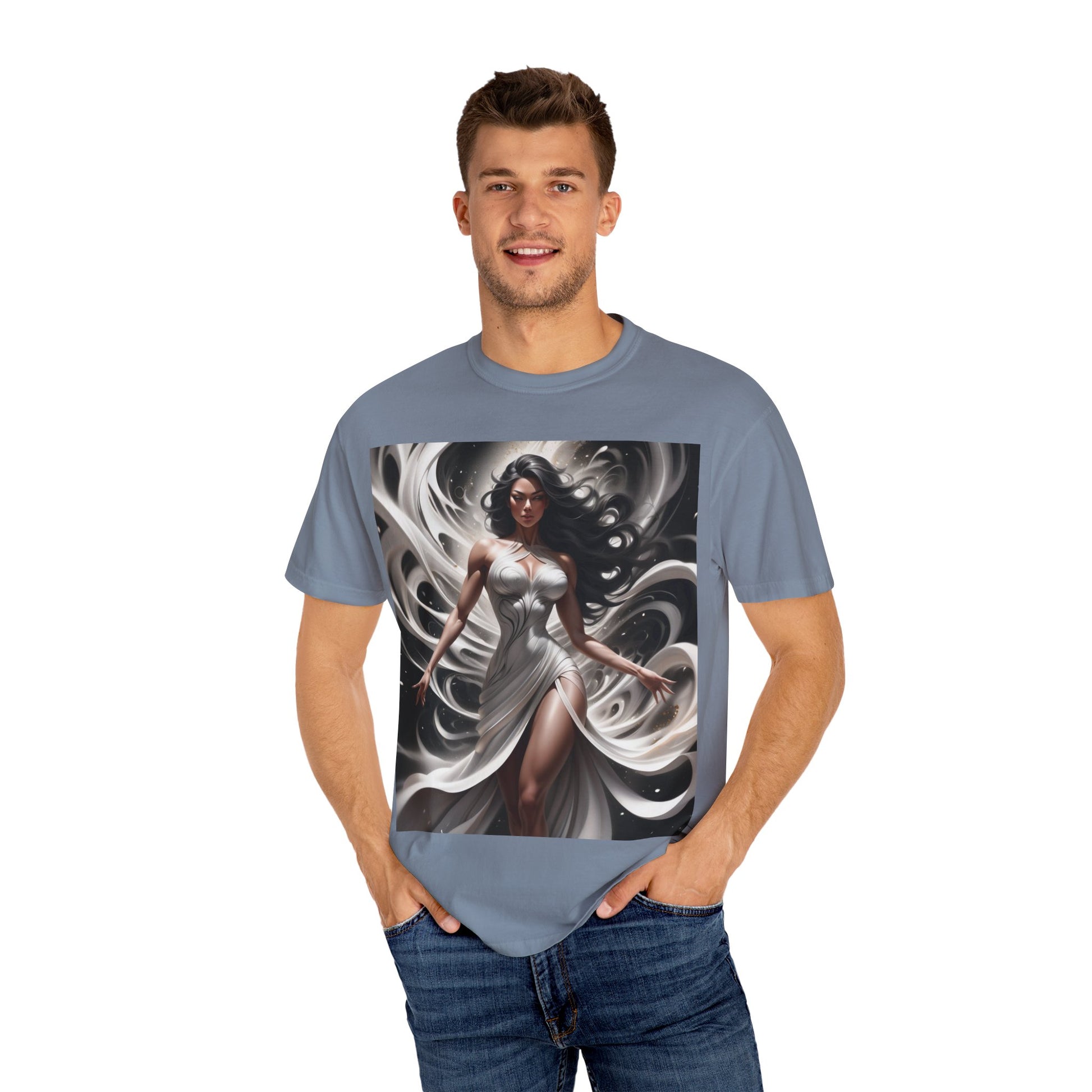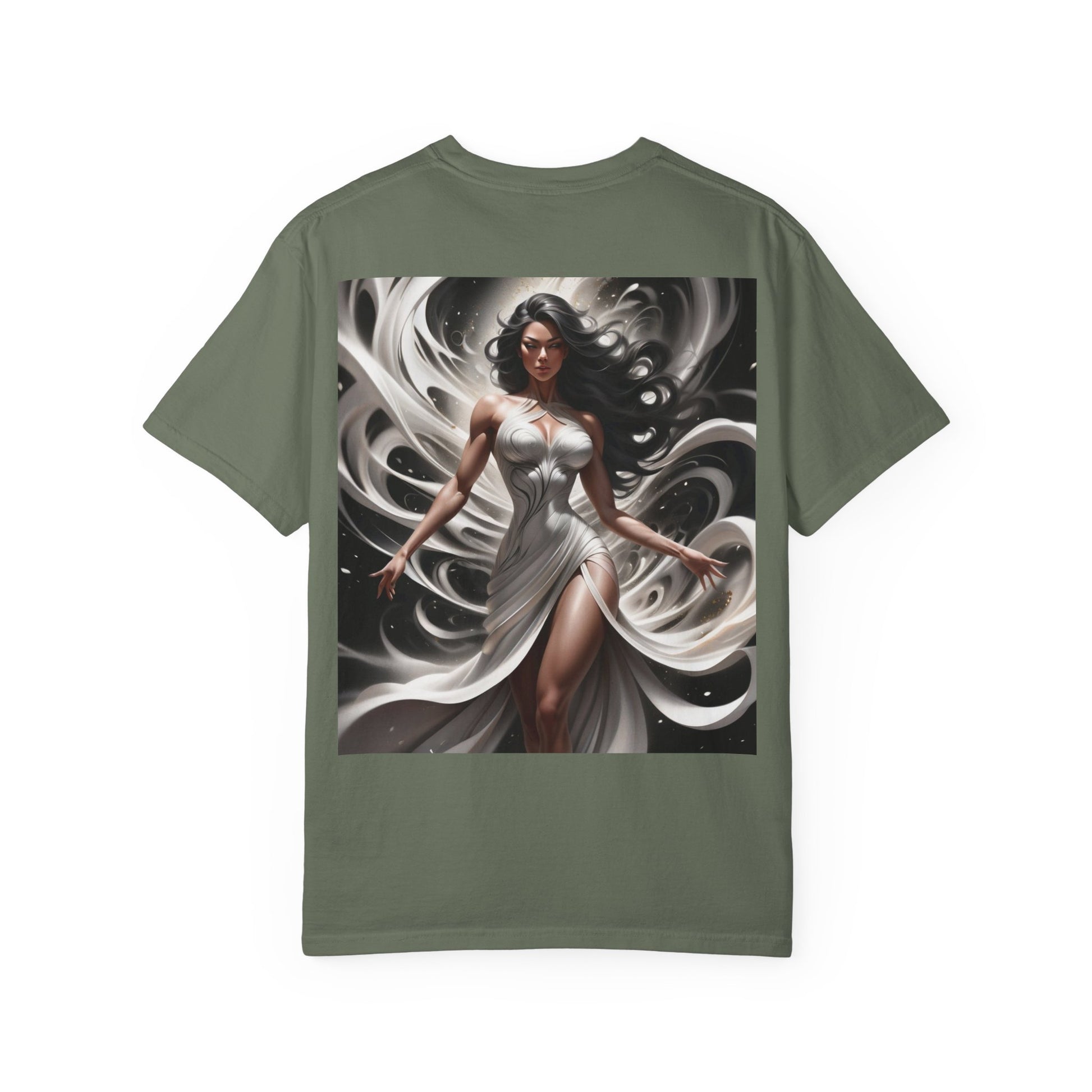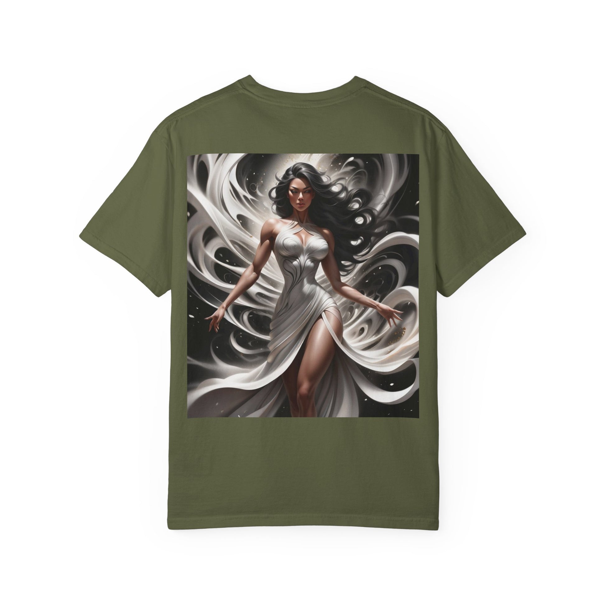 A relaxed, garment-dyed tee that carries the mood of a modern fantasy portrait—soft, lived-in color paired with a striking, art-forward print. The shirt’s medium-weight cotton drape and roomy cut let the illustrated figure breathe across the chest, while the garment-dye process gives the fabric a vintage-soft hand that deepens the artwork’s contrast. Wear it when you want your style to feel like part of a story: bold imagery with a quiet, comfortable base that moves with you throughout long days and late-night creative sessions.