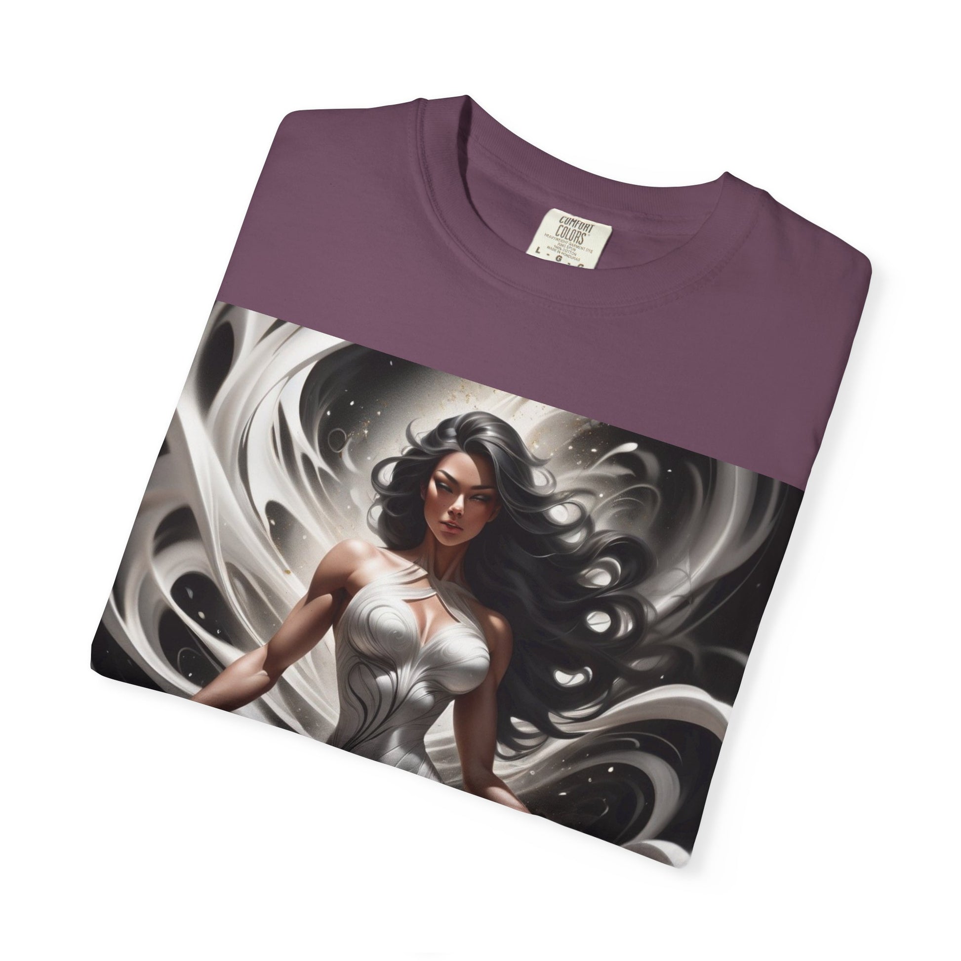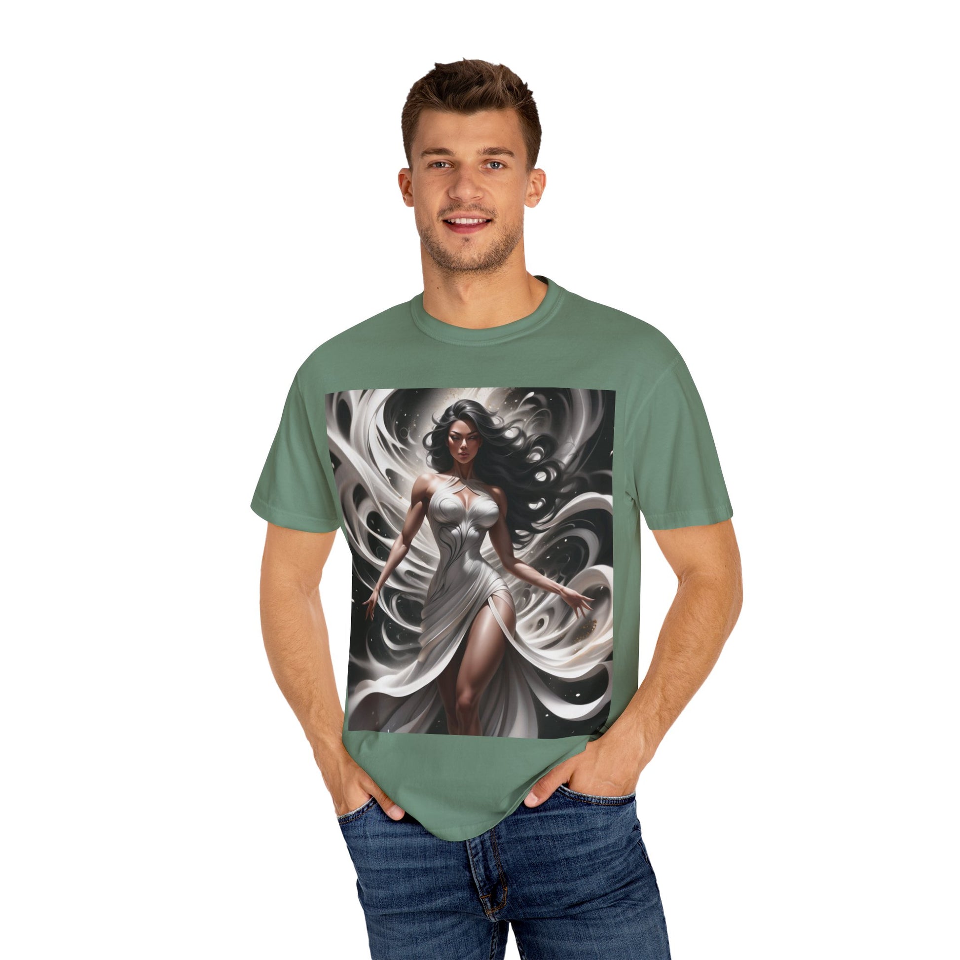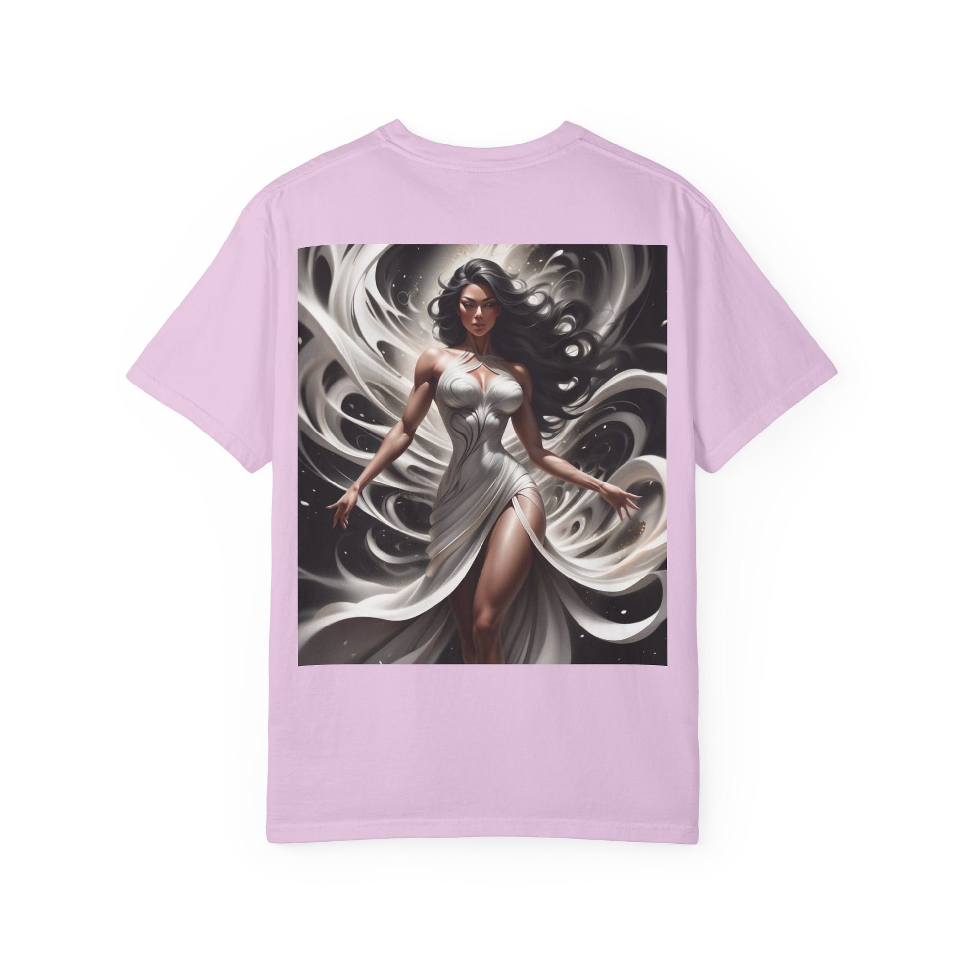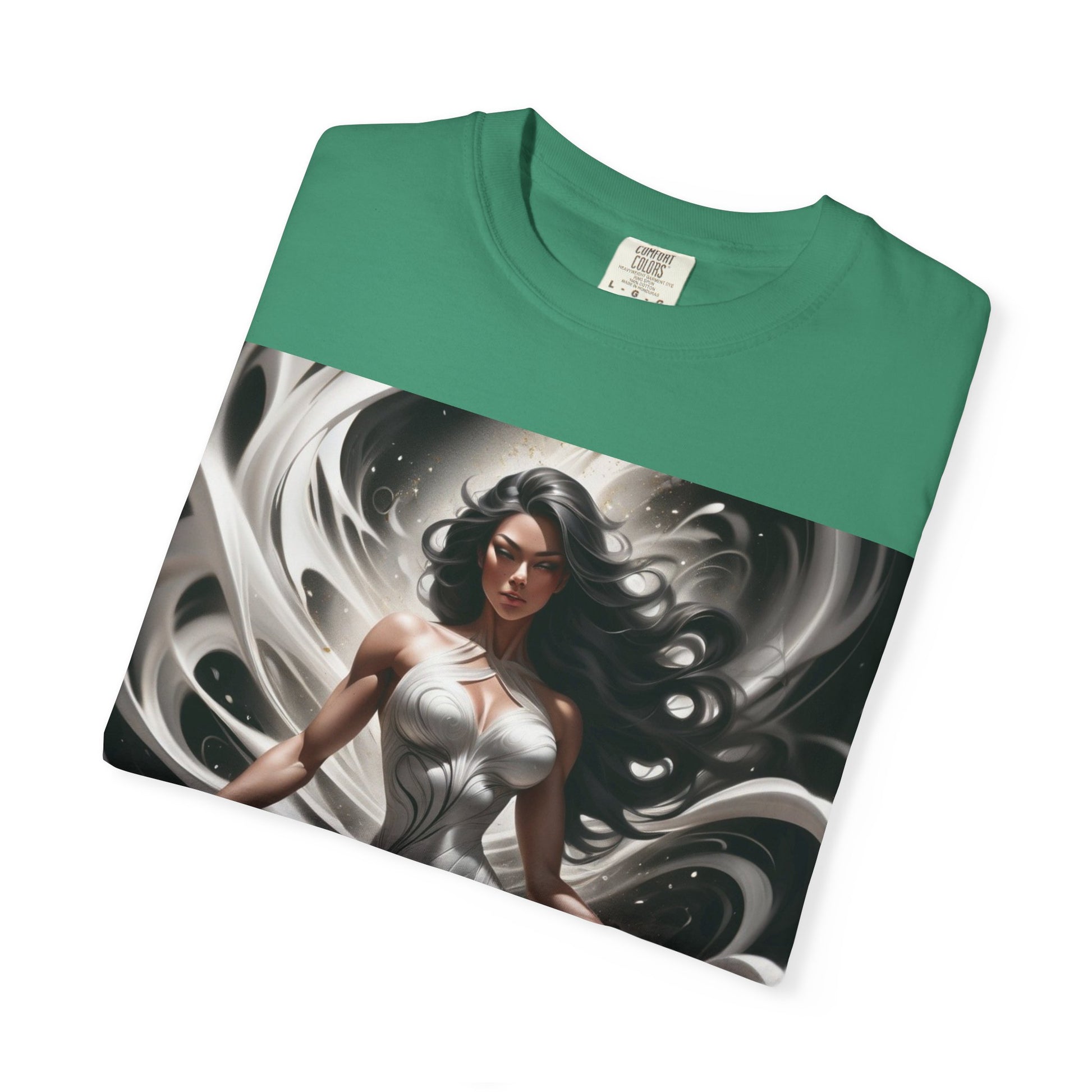 A relaxed, garment-dyed tee that carries the mood of a modern fantasy portrait—soft, lived-in color paired with a striking, art-forward print. The shirt’s medium-weight cotton drape and roomy cut let the illustrated figure breathe across the chest, while the garment-dye process gives the fabric a vintage-soft hand that deepens the artwork’s contrast. Wear it when you want your style to feel like part of a story: bold imagery with a quiet, comfortable base that moves with you throughout long days and late-night creative sessions.
