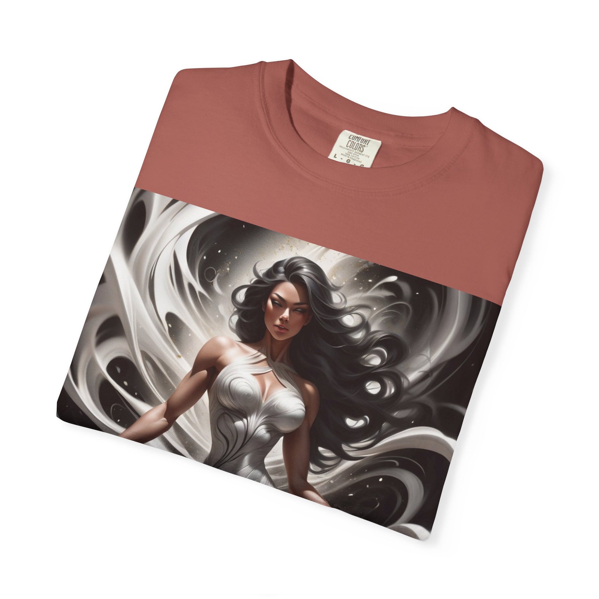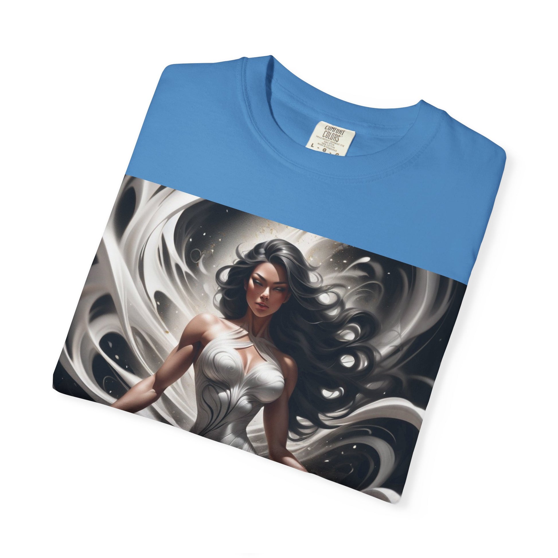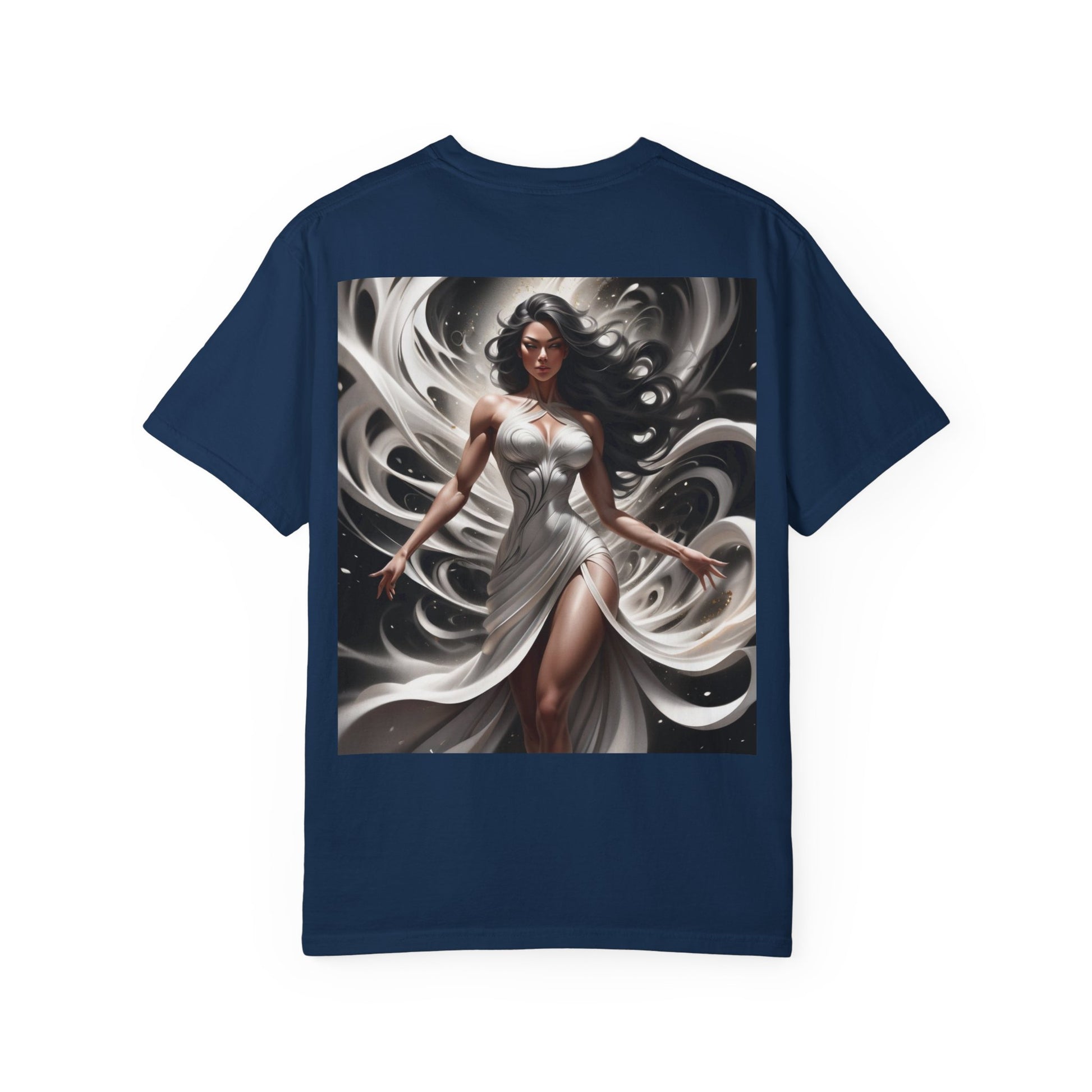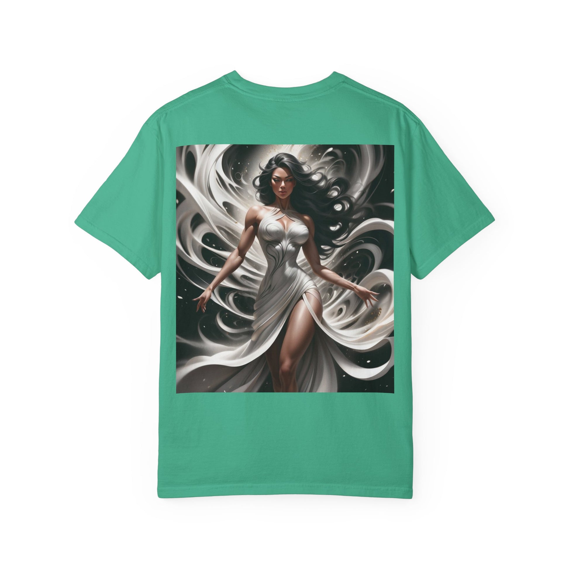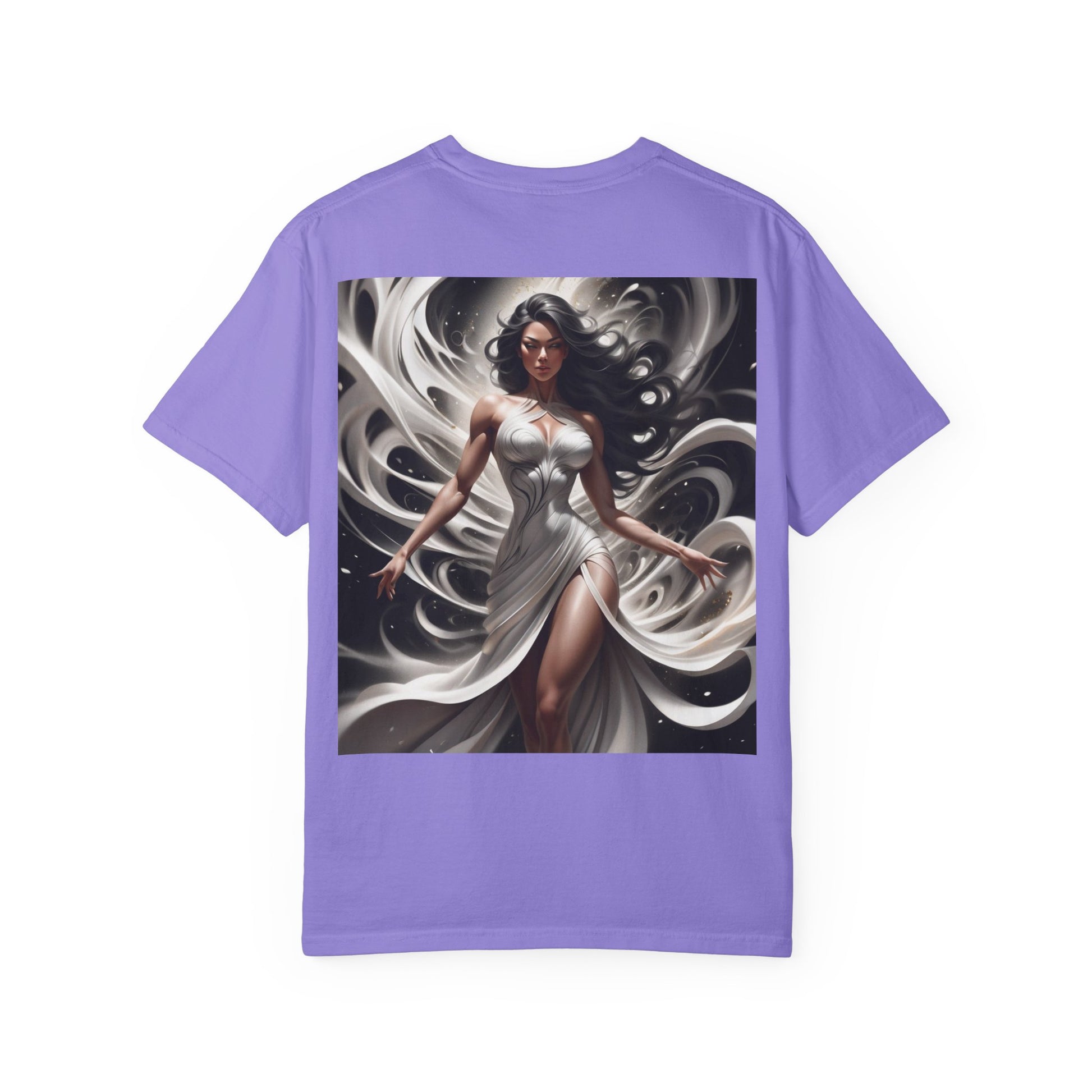 A relaxed, garment-dyed tee that carries the mood of a modern fantasy portrait—soft, lived-in color paired with a striking, art-forward print. The shirt’s medium-weight cotton drape and roomy cut let the illustrated figure breathe across the chest, while the garment-dye process gives the fabric a vintage-soft hand that deepens the artwork’s contrast. Wear it when you want your style to feel like part of a story: bold imagery with a quiet, comfortable base that moves with you throughout long days and late-night creative sessions.