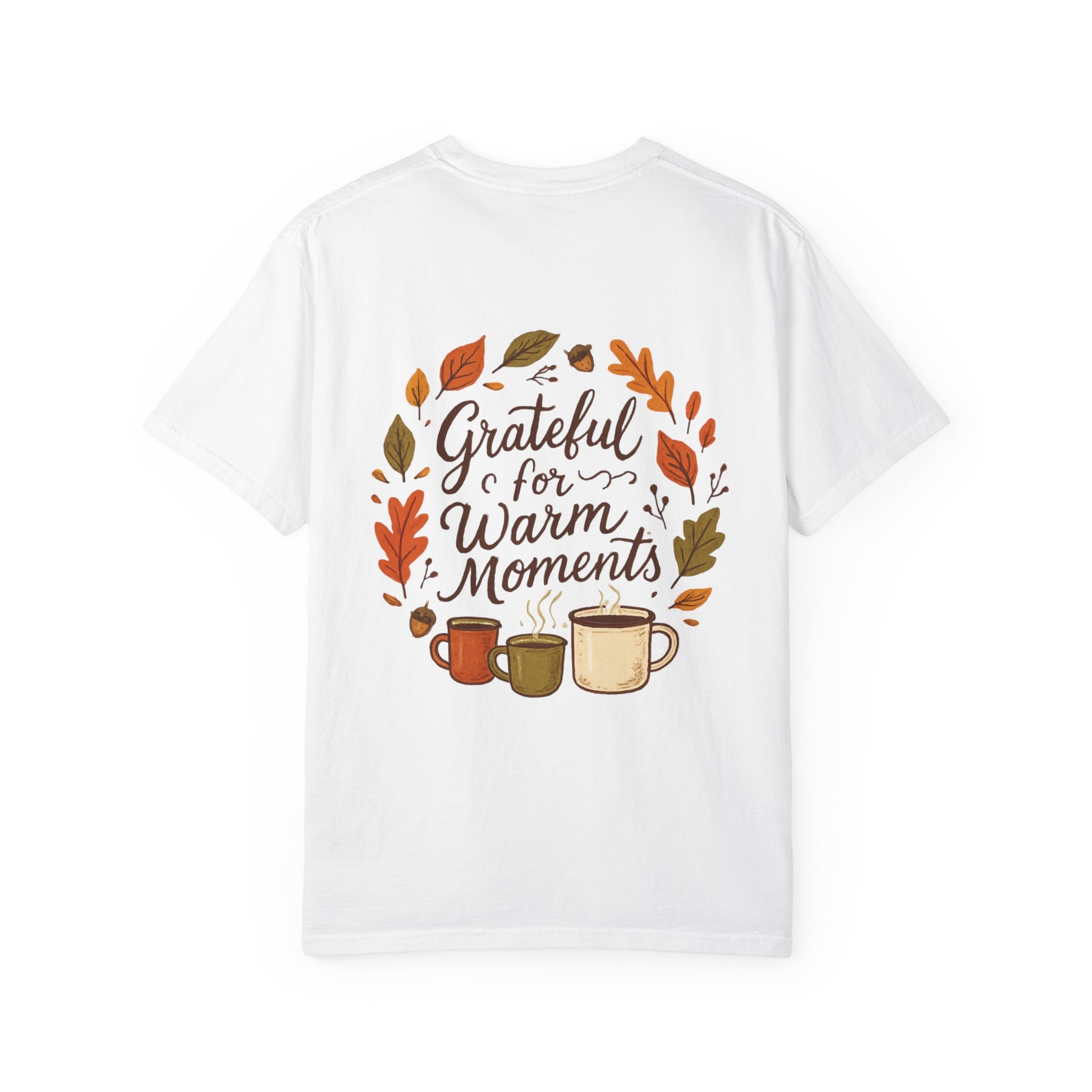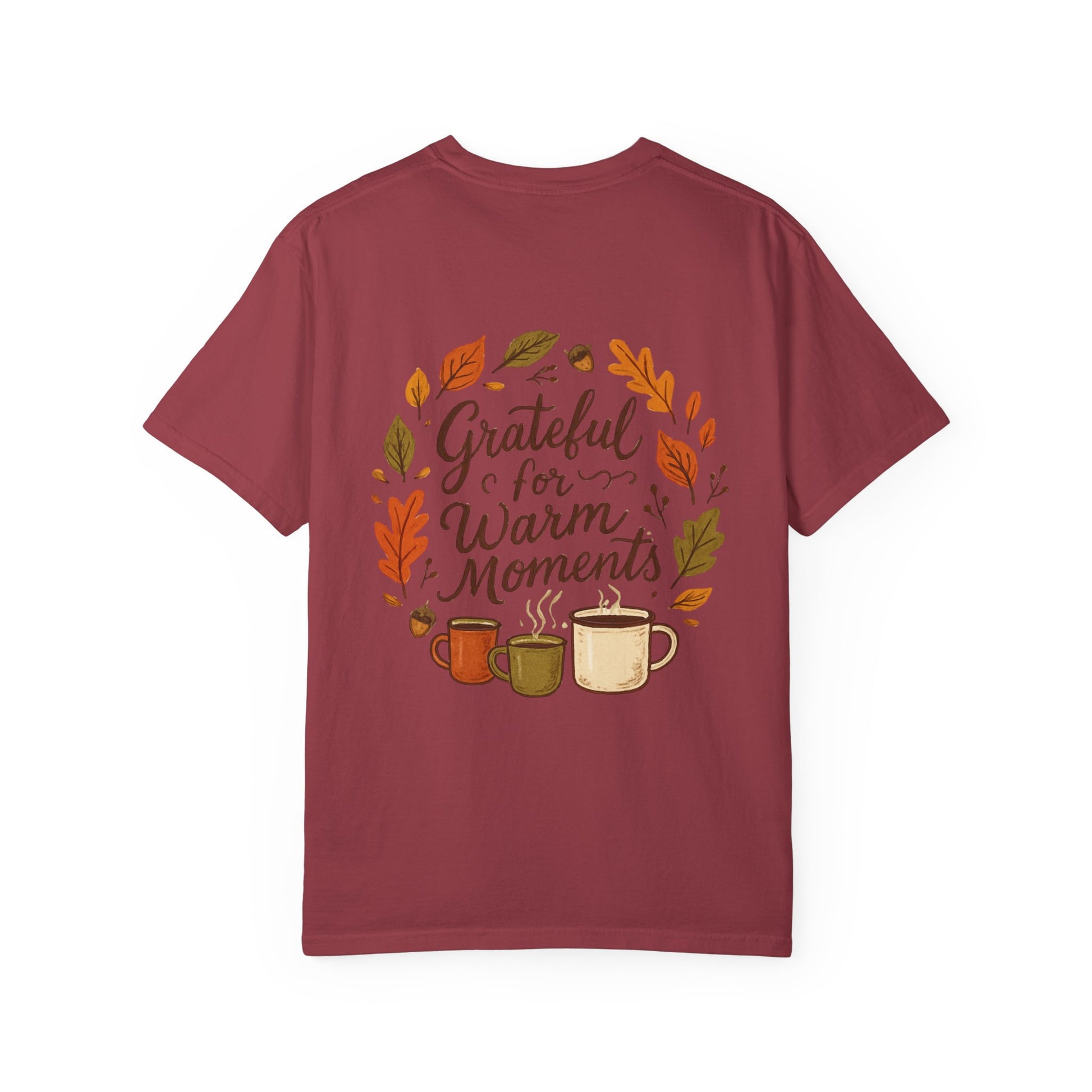 Soft, lived-in tee celebrating quiet warmth. This garment-dyed cotton shirt carries a hand-lettered message—"Grateful for Warm Moments"—framed by autumn leaves and steaming mugs. It feels like a slow morning: warm drink in hand, crisp air outside, and the comfort of a favorite shirt. Lightweight but substantial, the relaxed fit and vintage-dyed finish make it a go-to layer for weekend coffee runs, cozy porch chats, or low-key fall gatherings. The simple, earthy palette and subtle texture keep the look authentic and easy to wear with jeans, layered under a flannel, or paired with lounge staples.