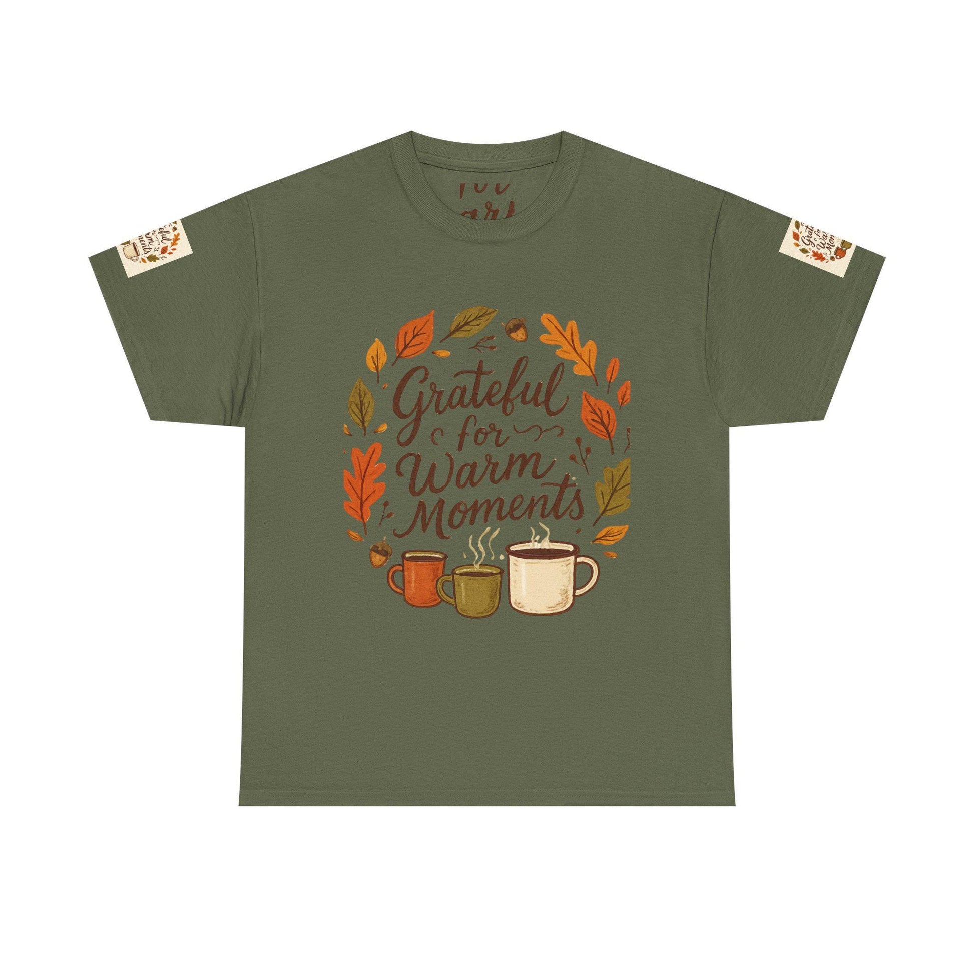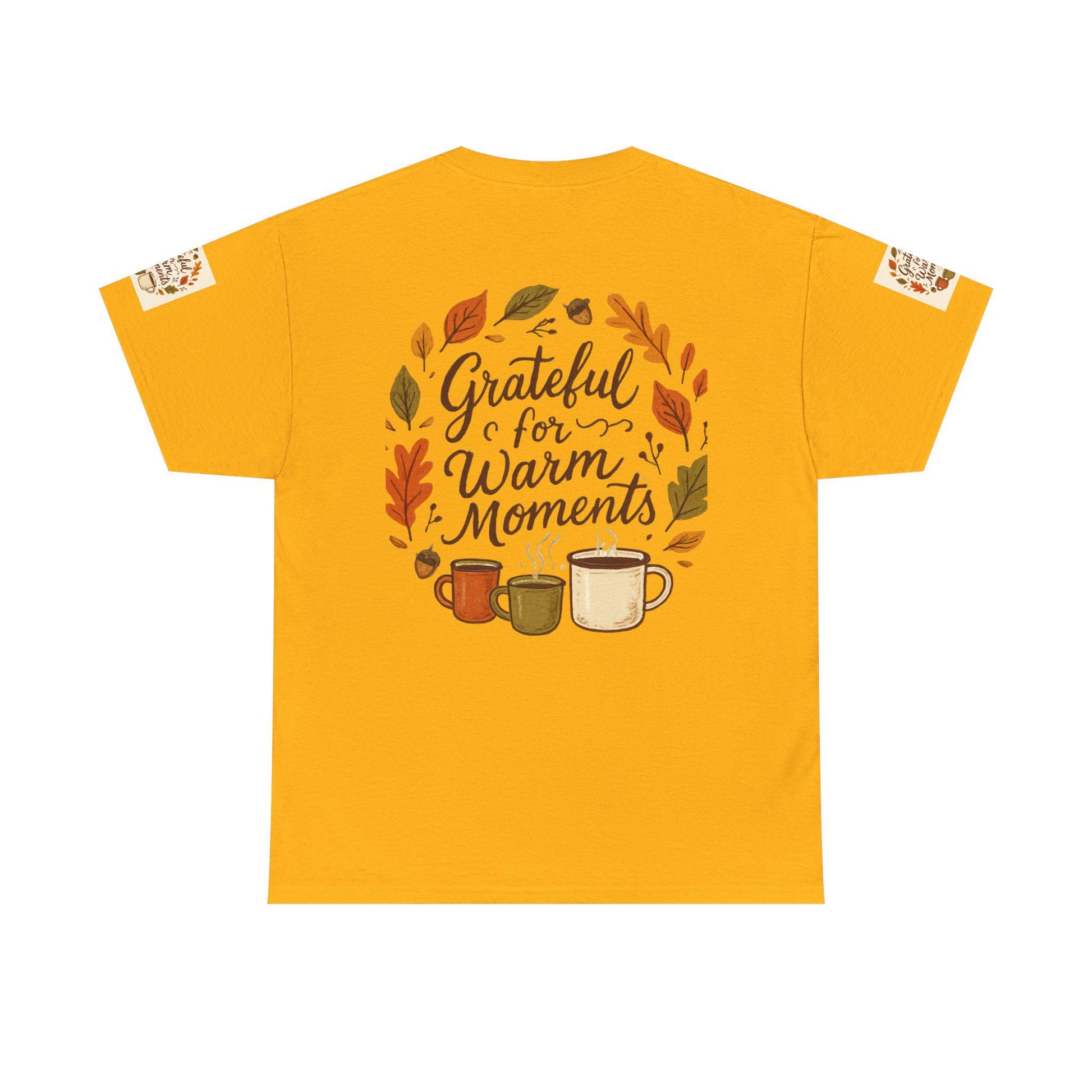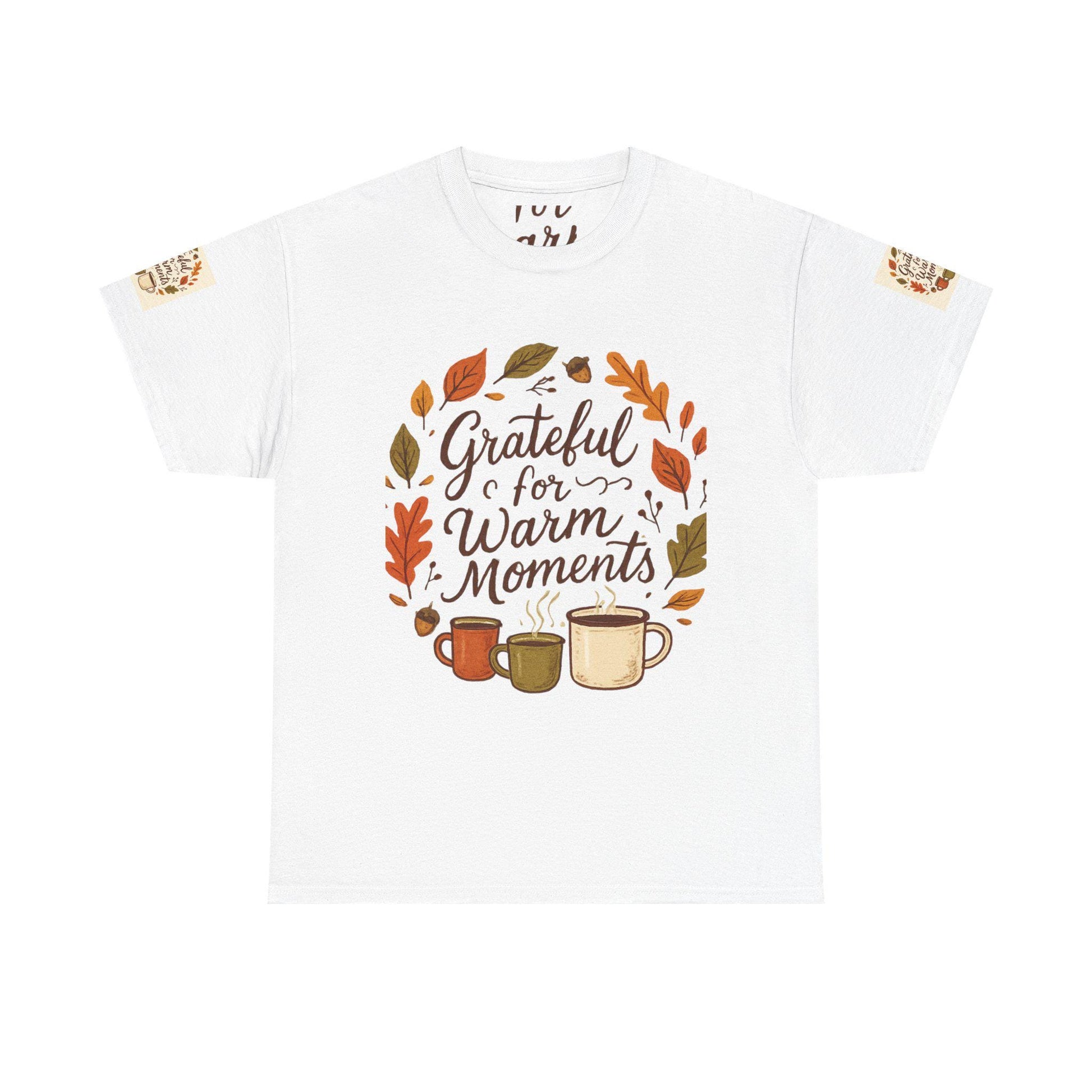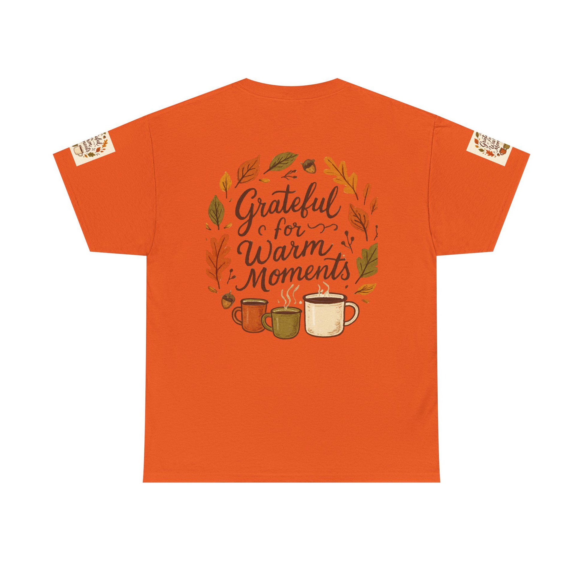 Soft, cozy, and quietly nostalgic — this classic tee carries a gentle reminder to slow down and savor the small, warm moments. A hand-lettered wreath of autumn leaves frames three steaming mugs and the phrase “Grateful for Warm Moments,” giving the shirt a homespun, cottage-core feel. Wear it on cool mornings with a scarf and your favorite mug in hand, or layer it under a cardigan for candlelit dinners and porch chats. Subtle sleeve accents echo the central design, so the warmth reads from every angle. Breathable cotton, a relaxed crew neck, and durable printing mean the message stays as comfortable as the shirt.