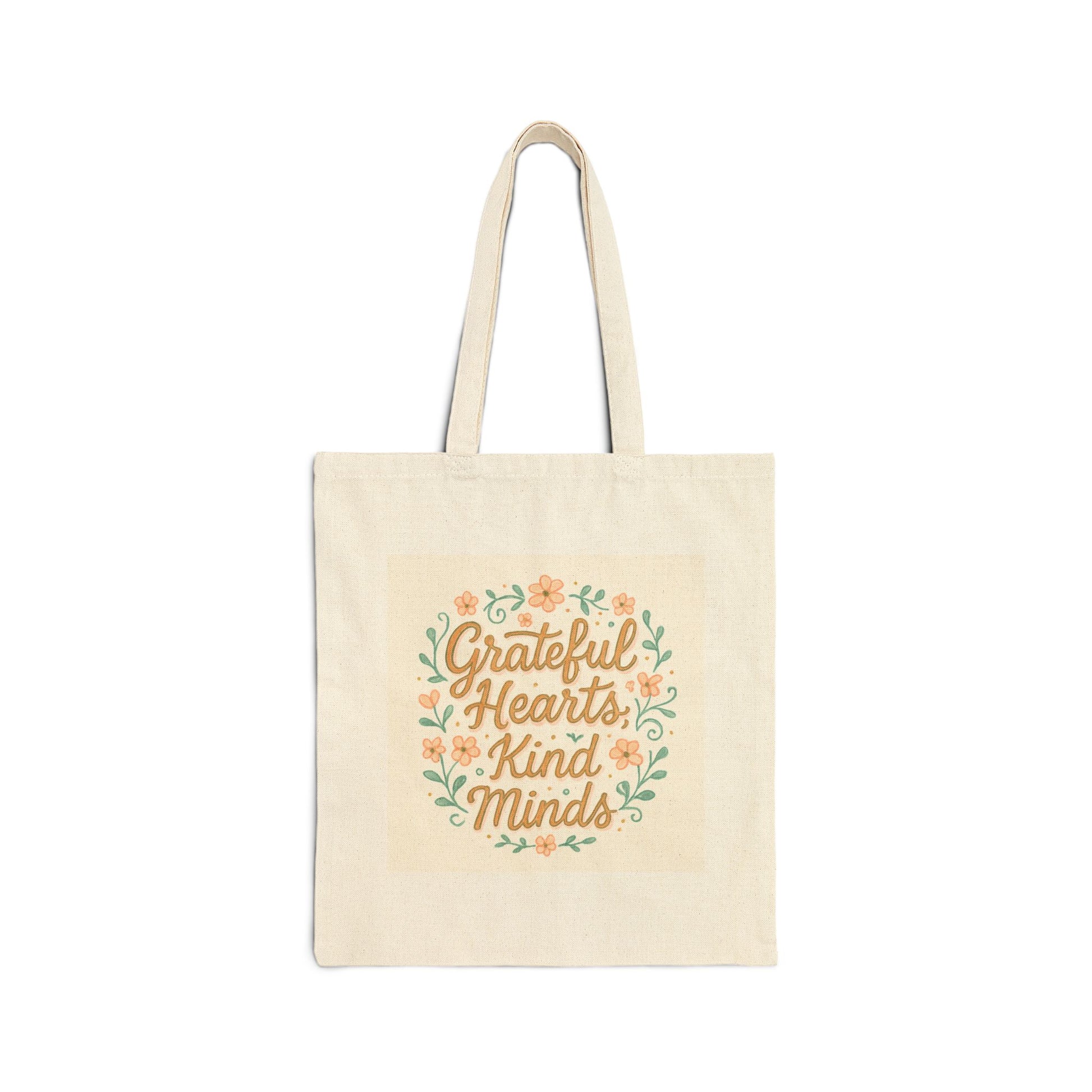 Light, sincere, and built to last — this cotton canvas tote carries more than errands. Soft natural canvas meets a warm, hand-lettered floral design that reads “Grateful Hearts Kind Minds,” a gentle reminder tucked into everyday routines. The heavy 12 oz fabric holds its shape under weight, while flat corners create a neat, structured silhouette that slides easily into grocery aisles, classroom doors, or coffee shop conversations. Long, reinforced handles sit comfortably on shoulder or arm, and the sewn-in label and sturdy construction promise repeated use. Choose natural or black to match a calm, intentional wardrobe and let a small, peaceful message travel with you. Product features - 100% cotton canvas, heavy 12 oz (406.9 g/m²) for durability - Flat-corner construction for a structured, slim profile - Self-fabric carrying handles with reinforced stitching for strength - Sewn-in label; blank product sourced from India - Available in natural and black color options Care instructions - Do not iron directly over the printed area - print may stick to the iron. - Spot clean - Do not bleach - Line dry