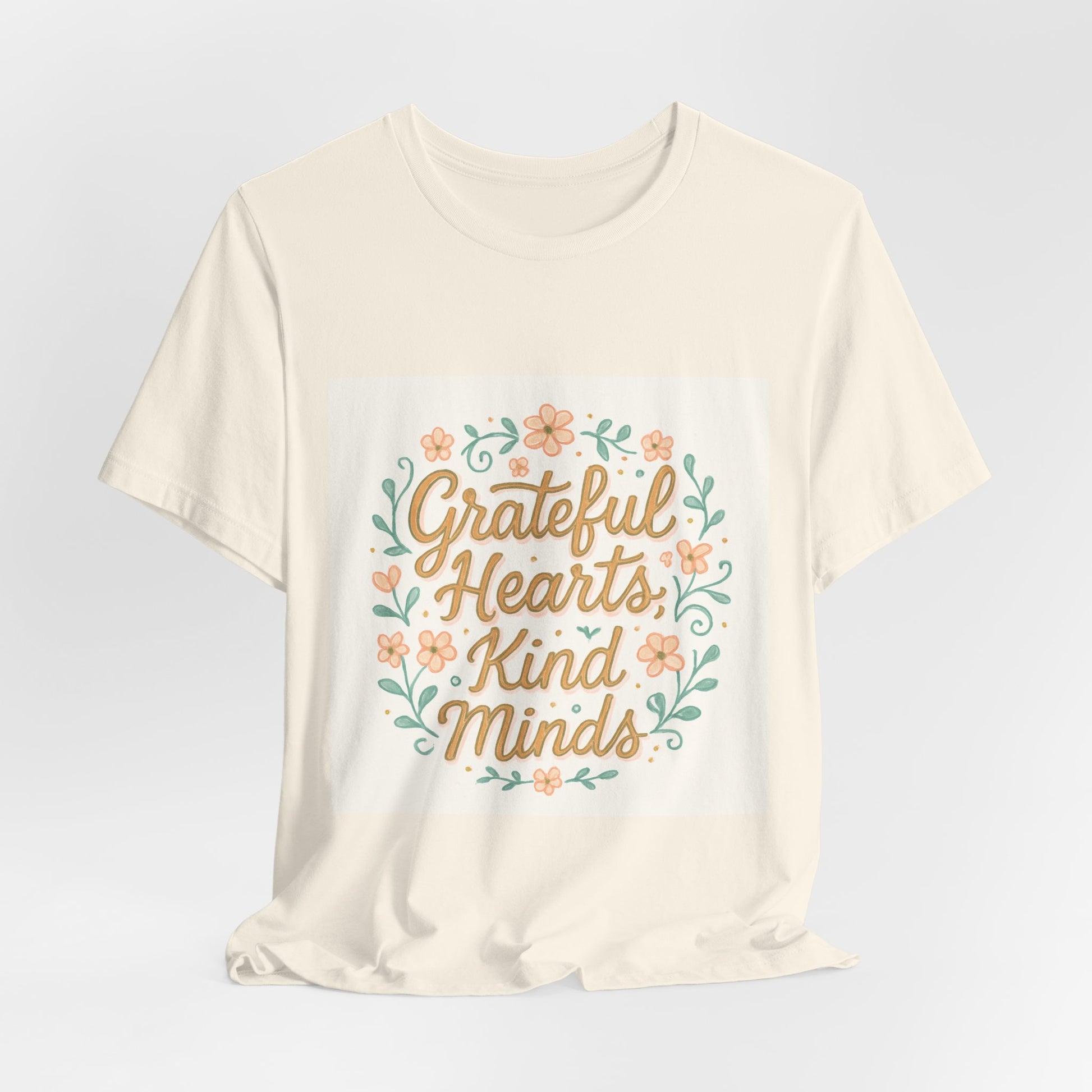 Lightweight and breathy, this tee carries a soft, hand-painted floral message that reads “Grateful Hearts, Kind Minds.” The gentle script and warm palette sit on a clean white canvas to create a calm, uplifting look you’ll reach for again and again. Wear it on slow mornings with jeans and a cardigan, or layer under a jacket when you head out for a community event—its retail fit and crew neckline keep things neat while the Airlume cotton feels effortless against skin. Thoughtful details like shoulder tape and side seams keep the shape intact through frequent wear, and the tear-away label minimizes irritation so the message takes center stage.