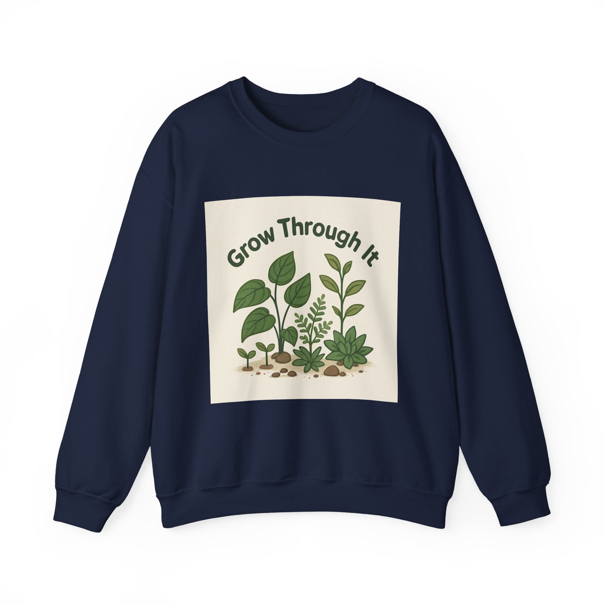 Soft, slightly oversized comfort with a gentle, plant-forward message. This crewneck sweatshirt wraps you in midweight warmth while a calm botanical print reads “Grow Through It” across the chest — little seedlings to leafy greens that feel like a quiet reminder to keep going. Wear it on slow mornings with coffee, while tending houseplants, or layered for cool walks. The color palette stays muted and natural, so the artwork feels like a small, mindful moment rather than loud branding. Product features - Midweight 50/50 cotton-poly blend (8.0 oz/yd²) for warmth and durability - Tubular knit body without side seams for a smooth, waste-reducing construction - Ribbed knit collar and double-needle stitching for shape retention and long-lasting wear - Embroidered and printed decoration options; DTG prints with DTF inner neck labels - OEKO-TEX dyes and ethically grown US cotton (US Cotton Trust Protocol) Care instructions - Machine wash: cold (max 30C or 90F) - Non-chlorine: bleach as needed - Tumble dry: low heat - Do not iron - Do not dryclean