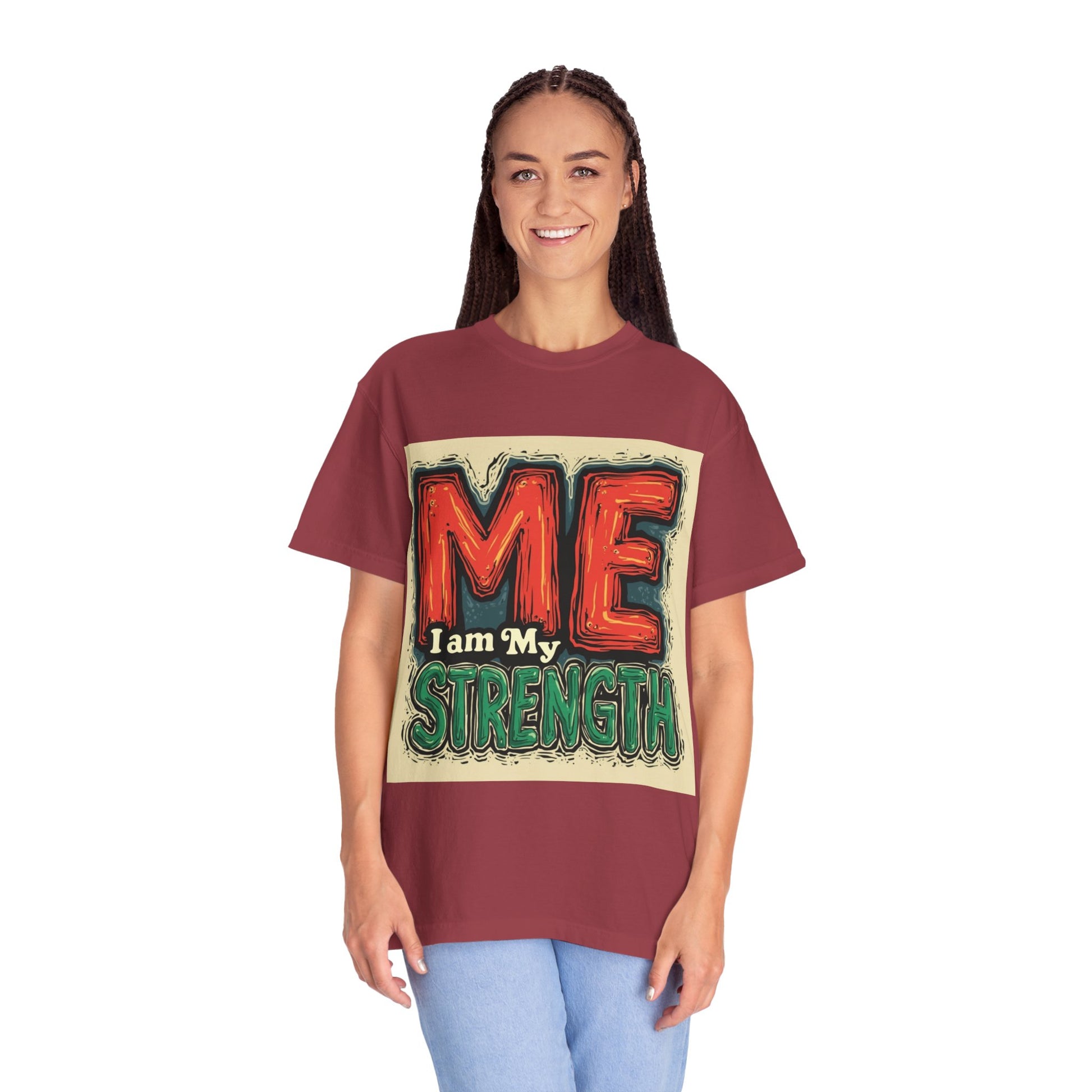 A soft garment-dyed tee that speaks with bold, hand-painted confidence. The front print reads “ME I am My STRENGTH” in vibrant, textured lettering—big, unapologetic, and warm. The relaxed silhouette and medium-weight 100% ring-spun cotton feel lived-in from the first wear, while the garment-dyed finish gives each shirt a gentle, vintage-rich hue. Wear it on days when you need a quiet reminder to rely on yourself, or layer it under a flannel for weekend errands and meetups. Subtle details — tubular knit, double-needle stitching, and a sewn-in label — keep the focus on comfort and longevity so the message remains with you wash after wash.