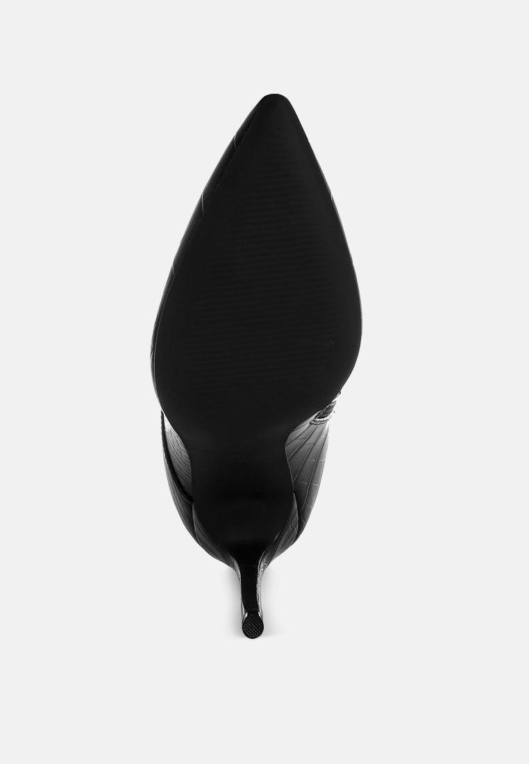 These faux leather boots featuring a croco textured detail all over make a stunning choice. The pointed toe and stiletto heel add to the style appeal. Team these boots with everything right from dresses, trousers or jumpsuits.