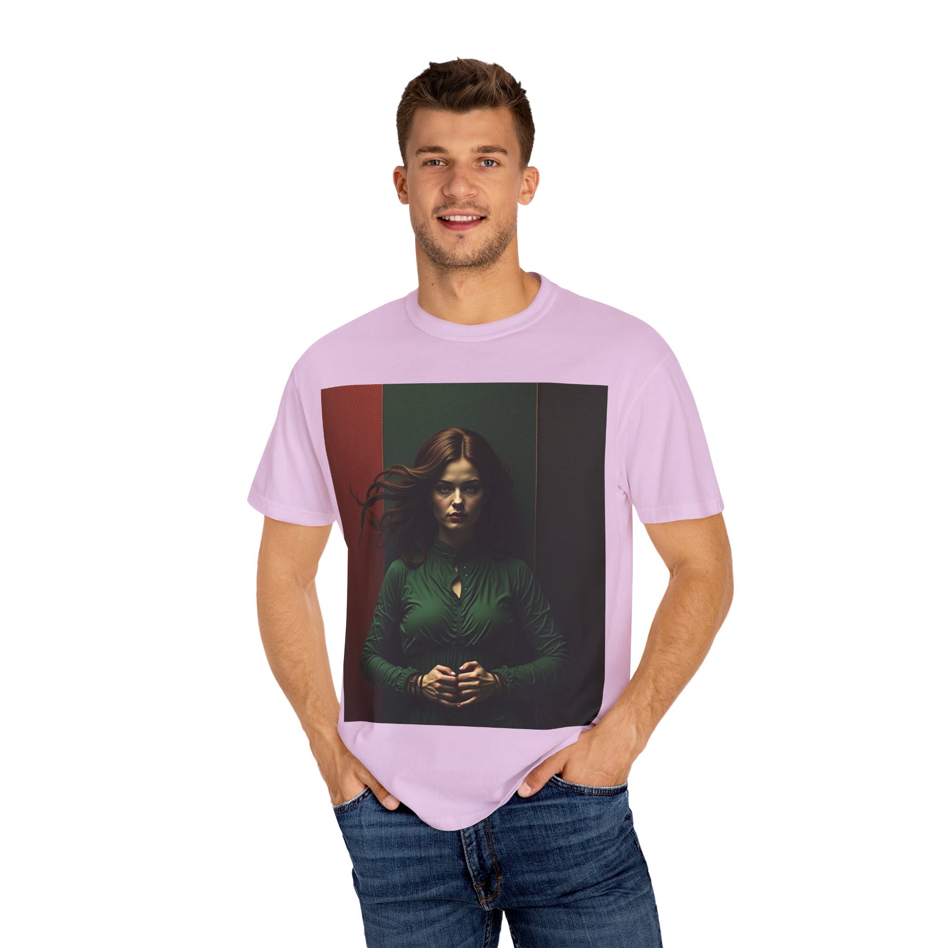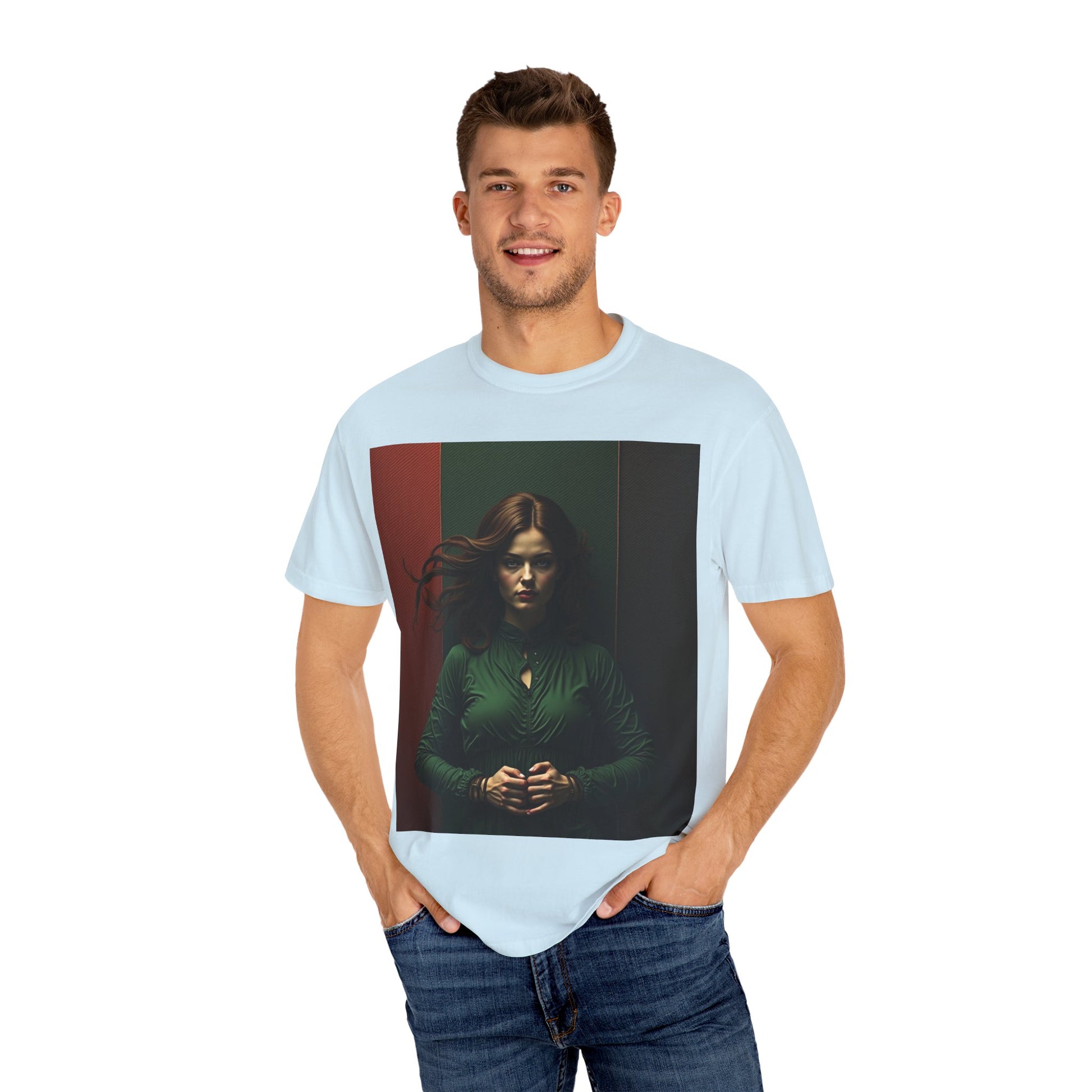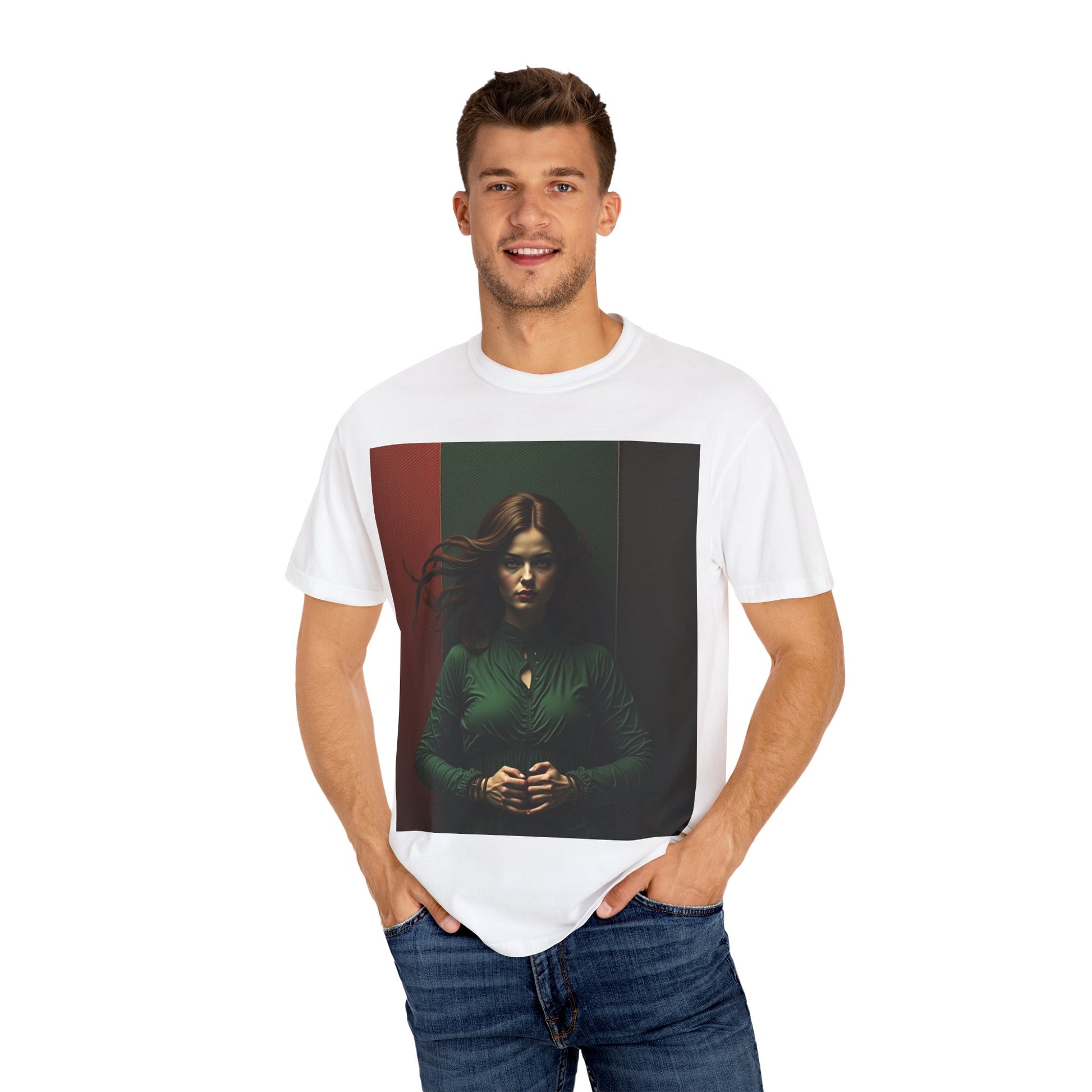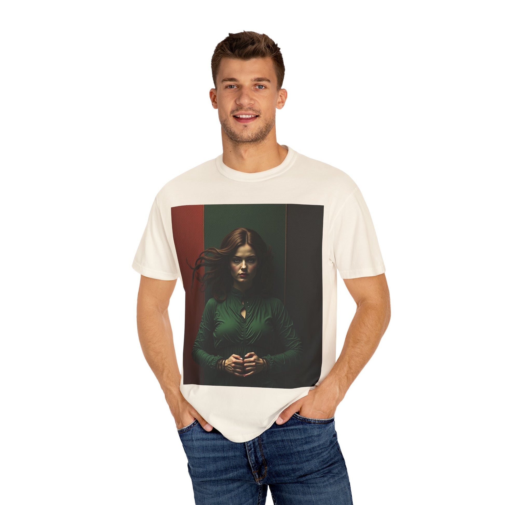 A softly worn garment-dyed tee that carries a quiet, cinematic mood. The print shows a moody portrait framed in deep greens and warm shadows—an image that feels like a stolen moment from an old film. The shirt’s relaxed cut and medium-weight cotton settle easily on the body, while the garment-dye process gives the fabric a lived-in tone and gentle texture that complements the vintage-inspired artwork. Wear it layered under a jacket for evening walks or loose at home when you want something that feels personal and a little mysterious. The sewn-in label and sturdy double-needle stitching mean this tee will age gracefully with repeated wear and washes.