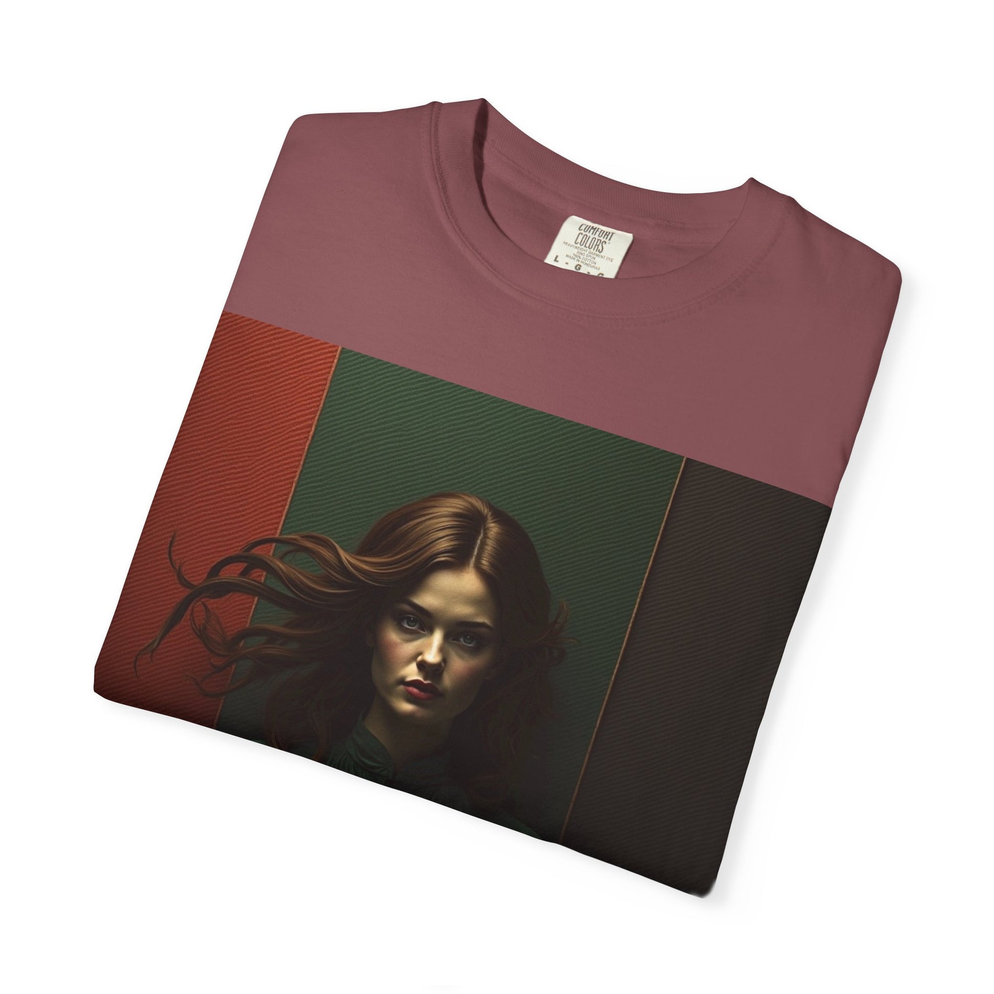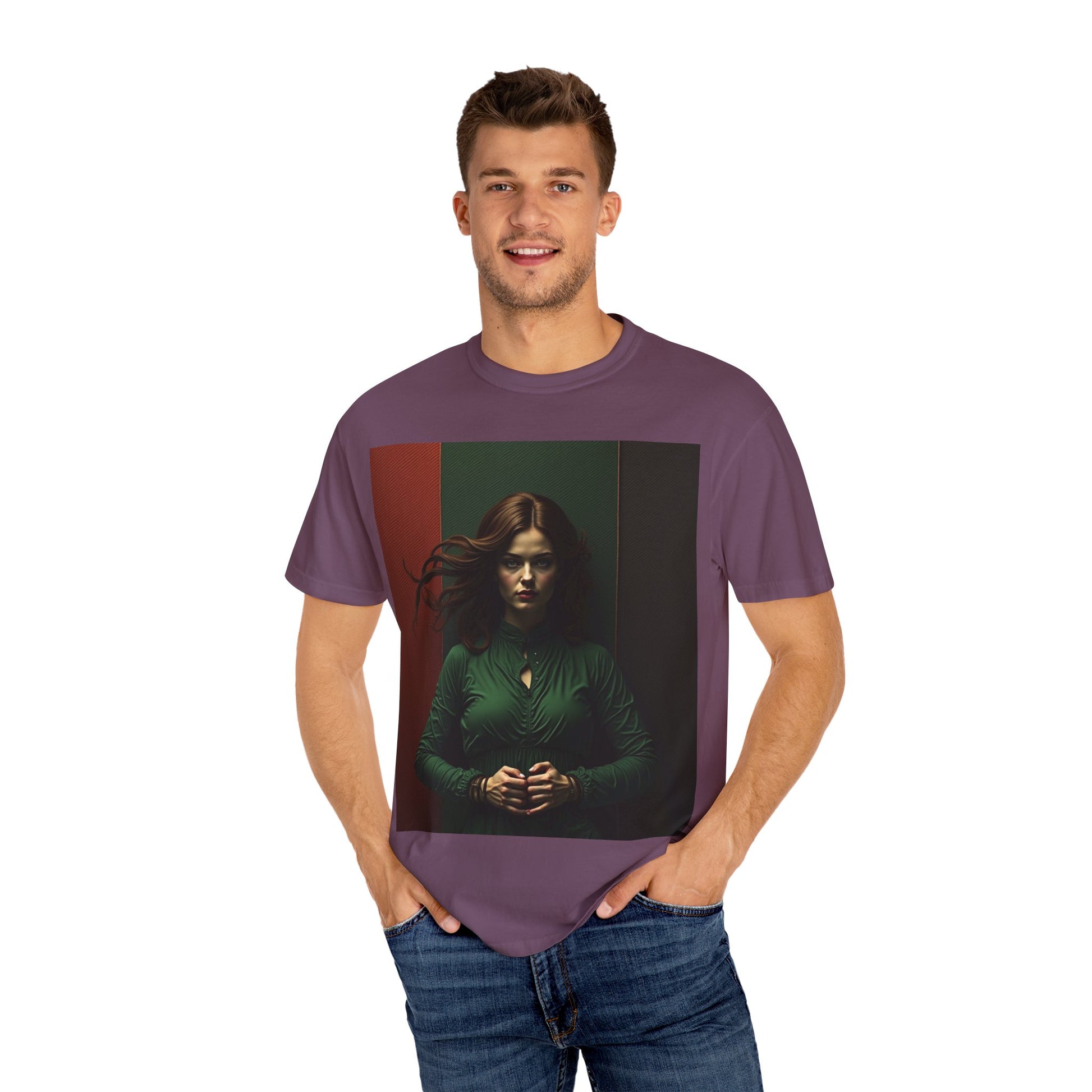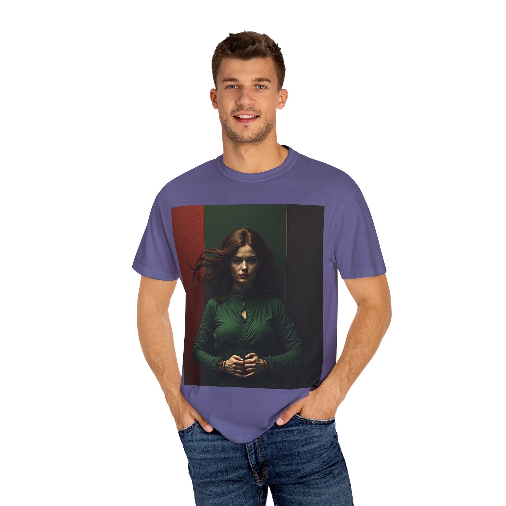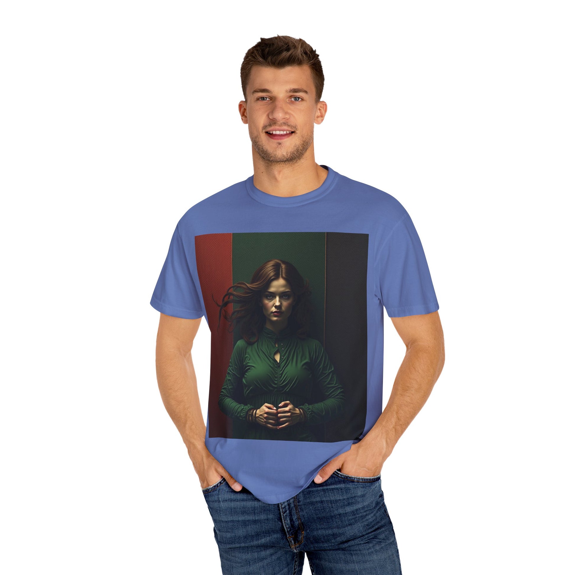 A softly worn garment-dyed tee that carries a quiet, cinematic mood. The print shows a moody portrait framed in deep greens and warm shadows—an image that feels like a stolen moment from an old film. The shirt’s relaxed cut and medium-weight cotton settle easily on the body, while the garment-dye process gives the fabric a lived-in tone and gentle texture that complements the vintage-inspired artwork. Wear it layered under a jacket for evening walks or loose at home when you want something that feels personal and a little mysterious. The sewn-in label and sturdy double-needle stitching mean this tee will age gracefully with repeated wear and washes.