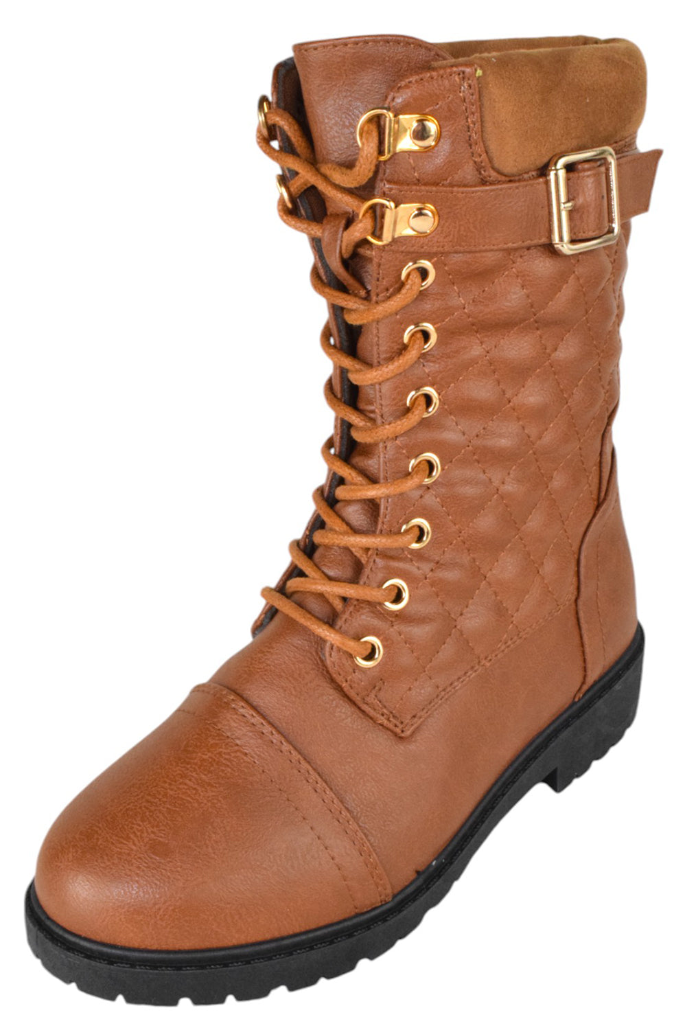 • Forever Women Mid-Calf Combat Army Style Quilted Boots Knitted Stitching Lace Up Lug Sole RAMONA-08