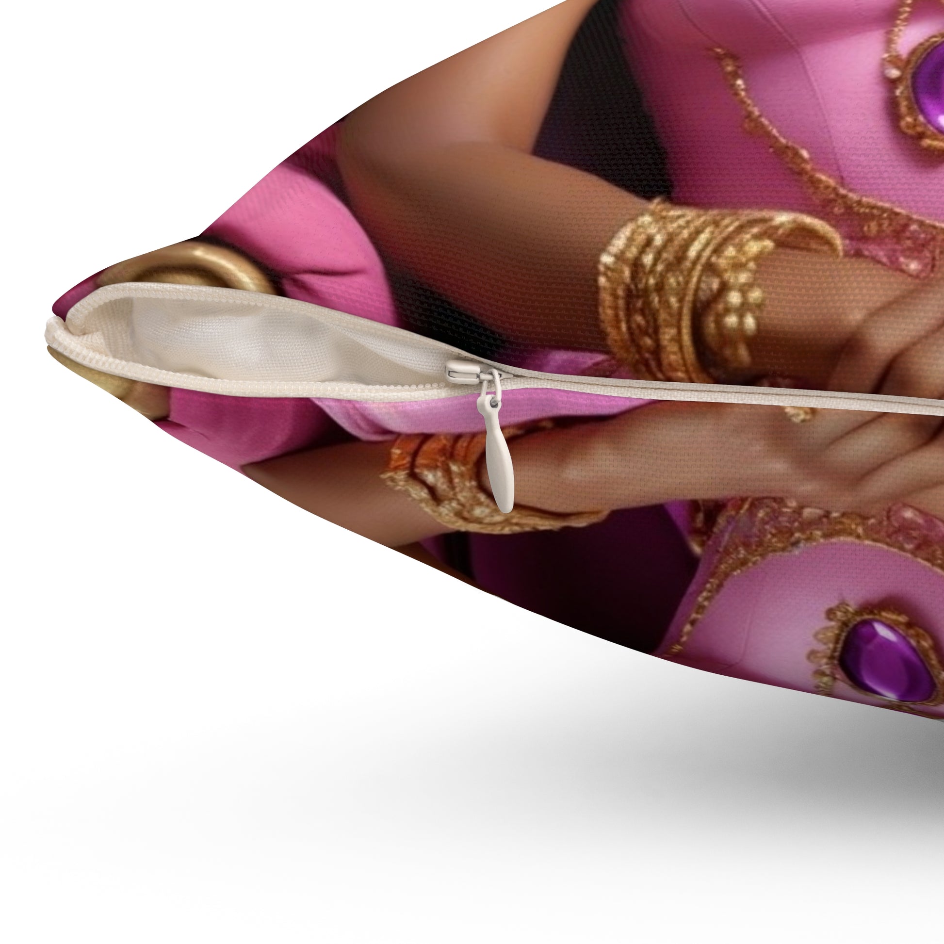 Settle into a moment of regal calm with this richly illustrated square pillow. The double-sided print features a poised, jewel-adorned queen rendered in warm mauves, golds, and rose tones — a piece that brings a quiet, luxurious presence to a reading nook, boudoir, or living room. The spun polyester cover keeps the colors vivid and the silhouette crisp, while the recycled polyester insert adds plush volume once you stuff it. Tuck it against a chair or layer it with textured throws to create an intimate corner that feels both curated and personal.