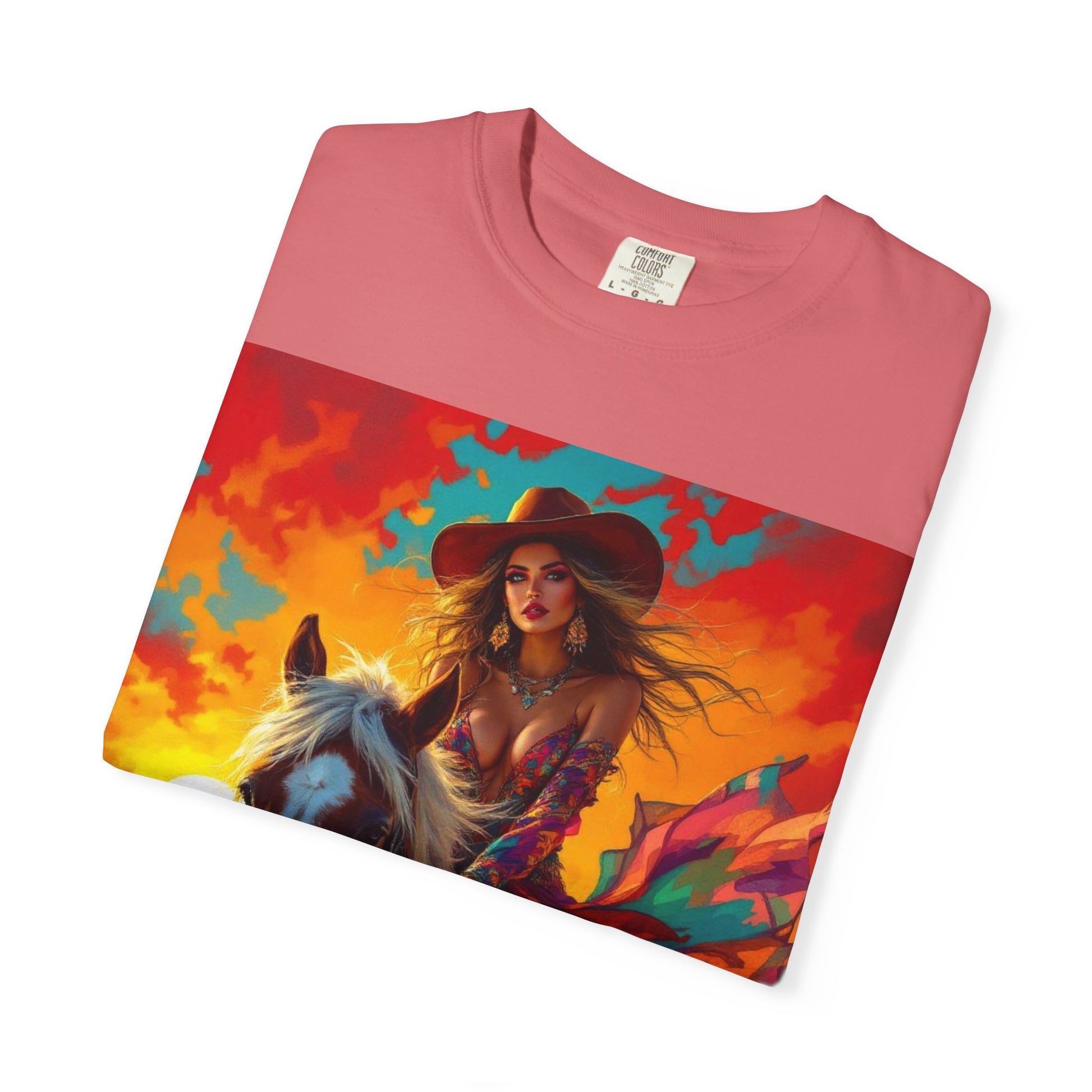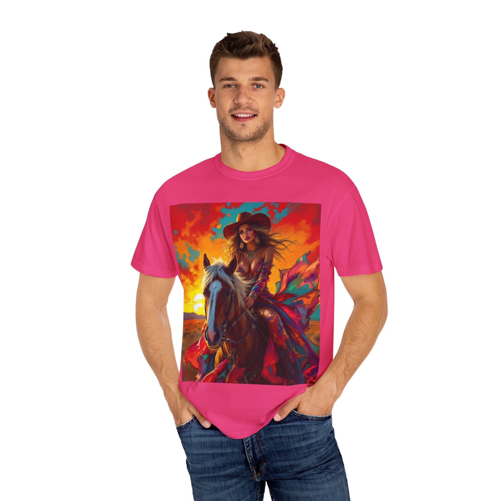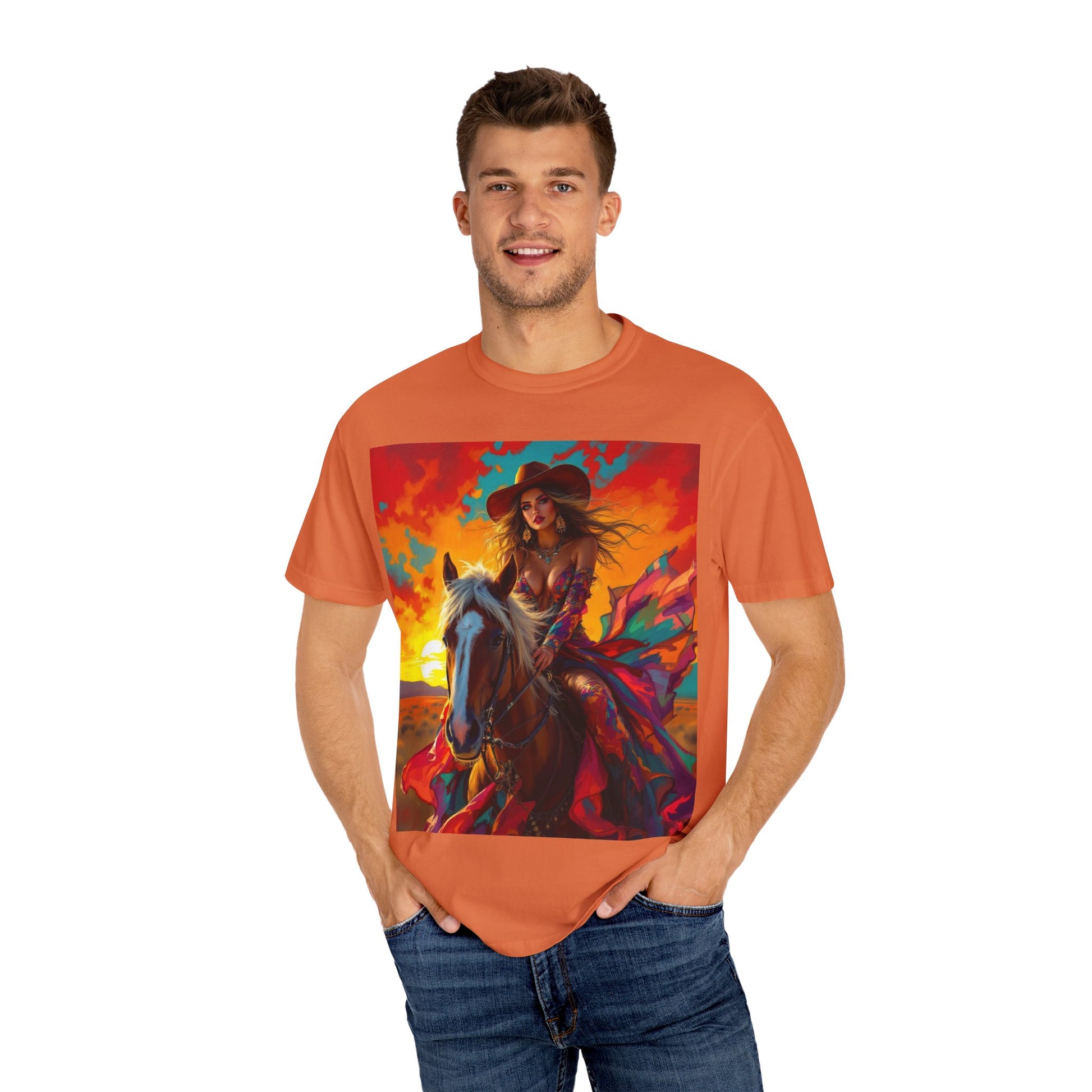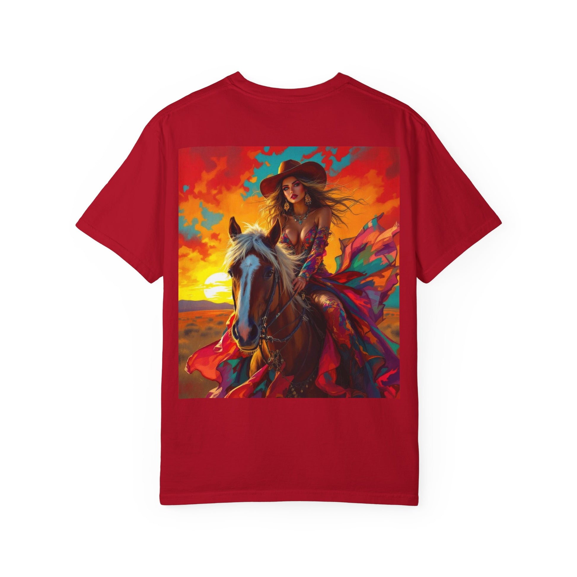 A bold, wearable print that brings sunset horizons and wild spirit to everyday outfits. This garment-dyed tee features a vivid, painterly image of a woman riding a horse across a glowing sky — colors burn like firelight against the soft, lived-in cotton. It drapes with a relaxed fit and a medium-weight hand, aging beautifully with wash and wear so the art becomes part of your daily rhythm. Wear it to feel adventurous on ordinary days, to carry a bit of open-country warmth into city streets, or to mark a night around a backyard fire with friends.
