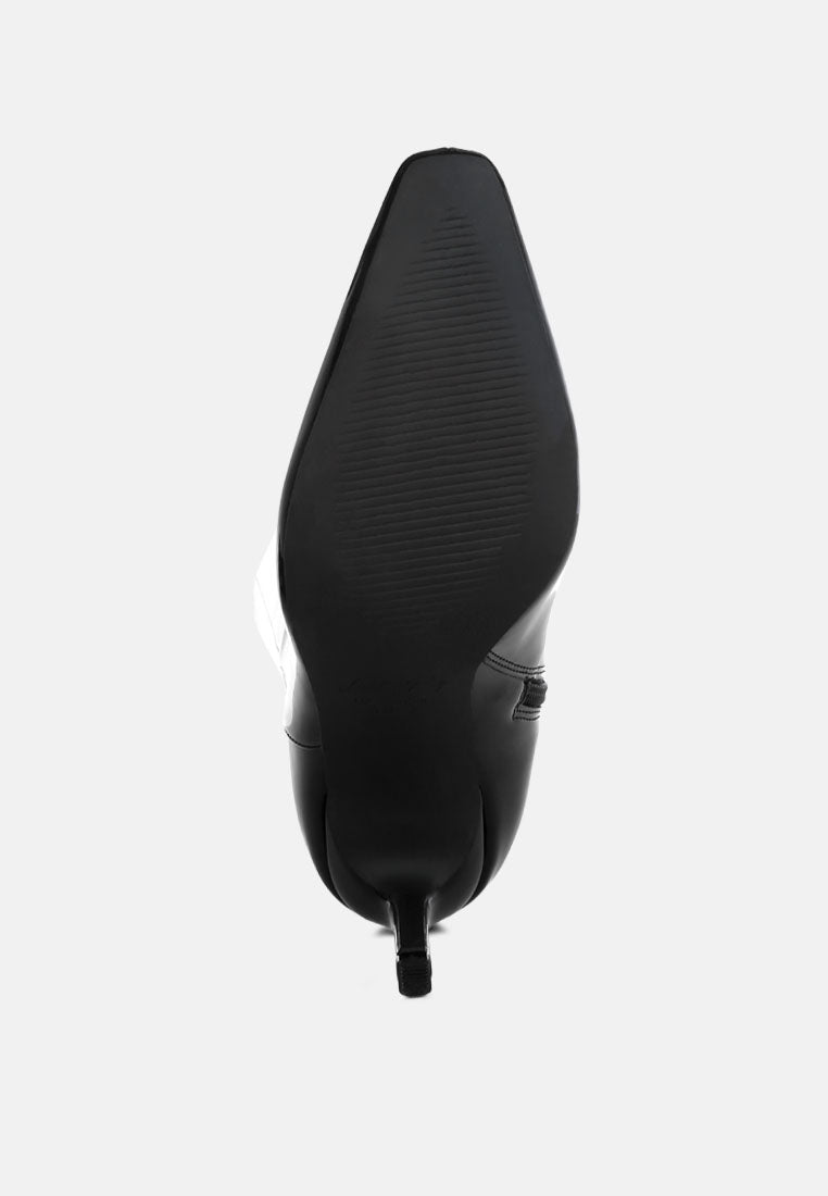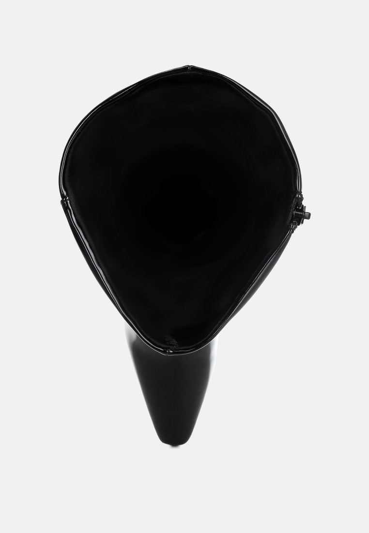 The patent faux leather calf boots have a decadent candy-like aesthetic with the shiny patent detail, the snip toe adds a quirky visual detail while the stiletto heels look sexy. The calf boots have a quirky yet chic allure which is sure to elevate any outfit you pair it with. The boots have an easy to wear zipper fastening and soft cushion insoles that offer a comfortable walkability feature.
