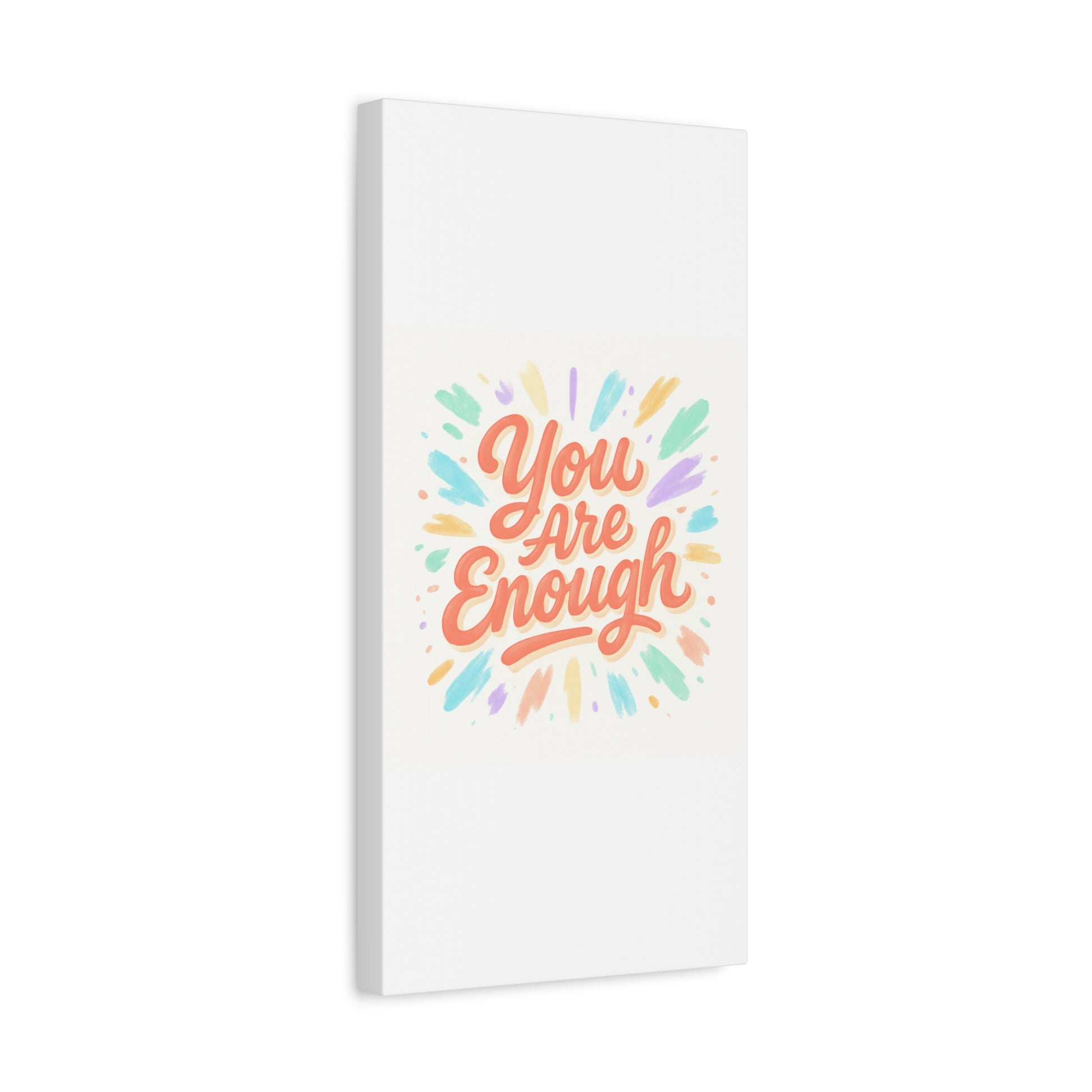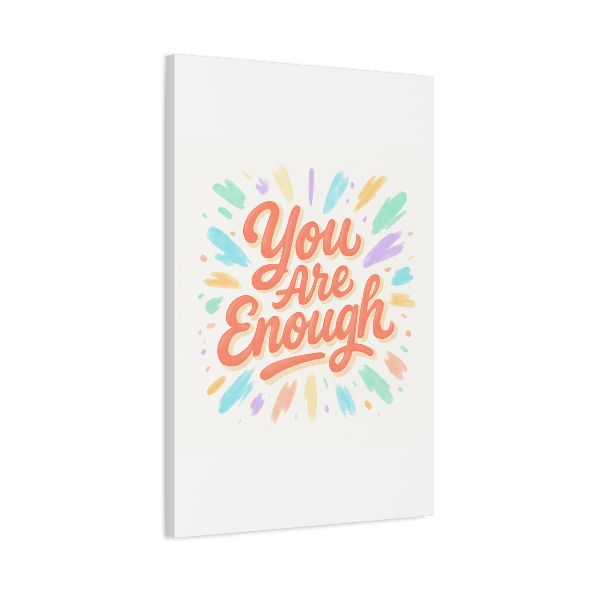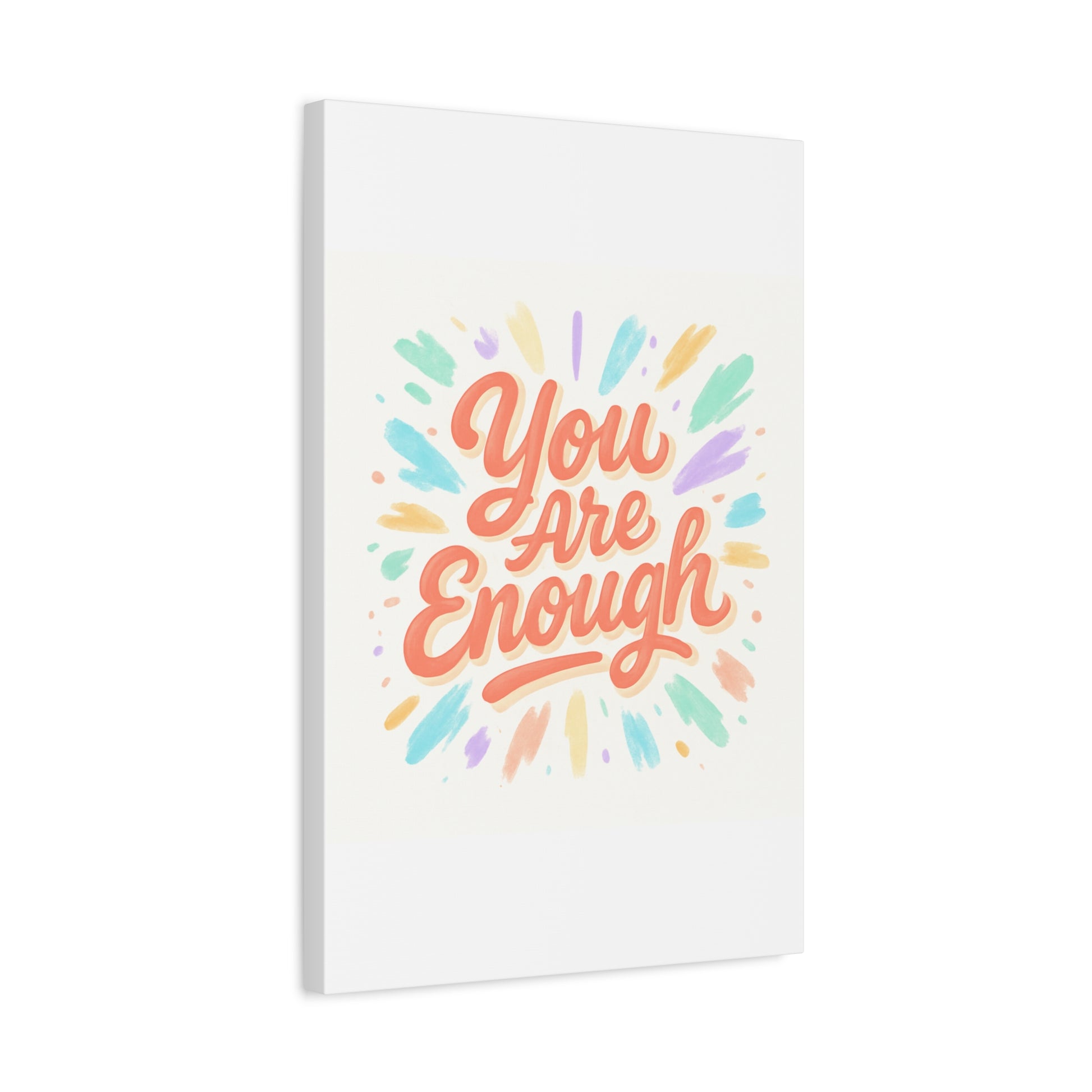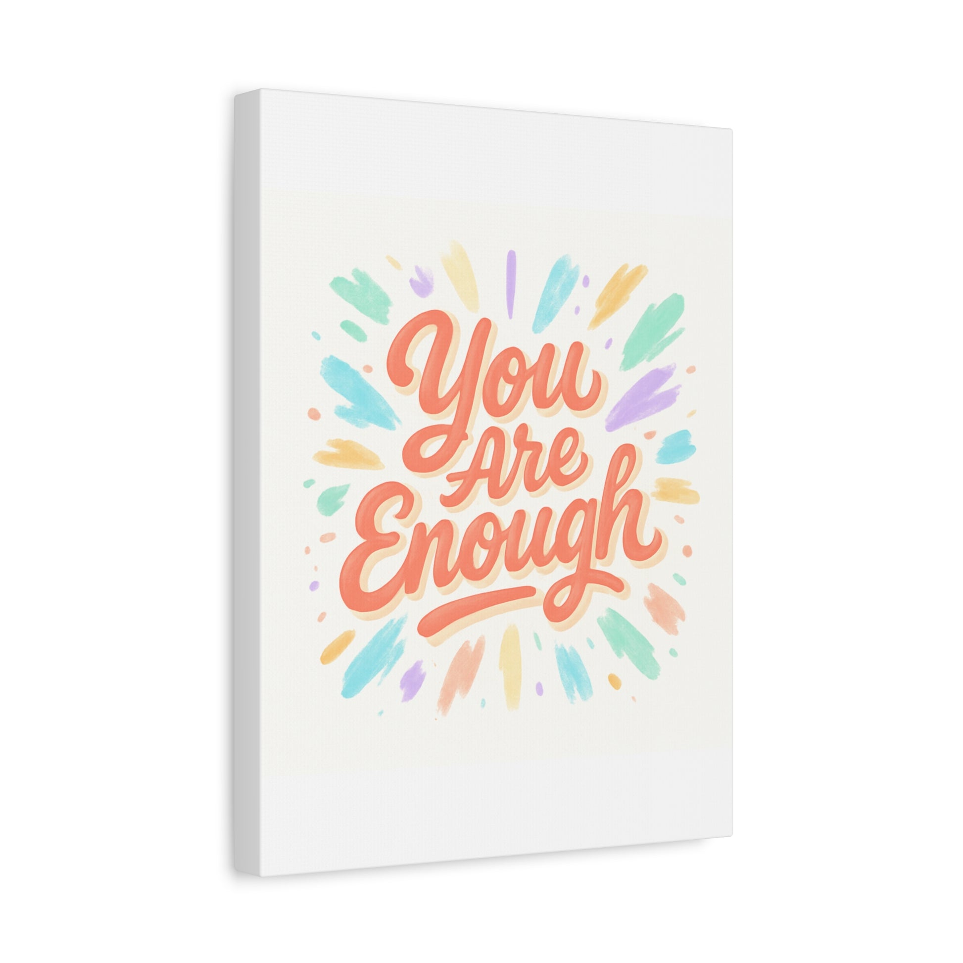 Bright, hand-lettered affirmation printed on a matte stretched canvas that brings a gentle, uplifting energy to any wall. Soft coral lettering — "You Are Enough" — radiates warmth while pastel brushstroke bursts in mint, lavender, peach, and gold add a light, painterly glow. The textured cotton-poly canvas and clean white edges give it an artisanal, gallery-ready feel that fits a cozy bedroom, home office, or calming nook. Subtle depth from the 1.25" profile makes the artwork feel present without overwhelming a space. Hang it solo for a focused statement or pair with framed photos and plants to build a quietly hopeful vignette.