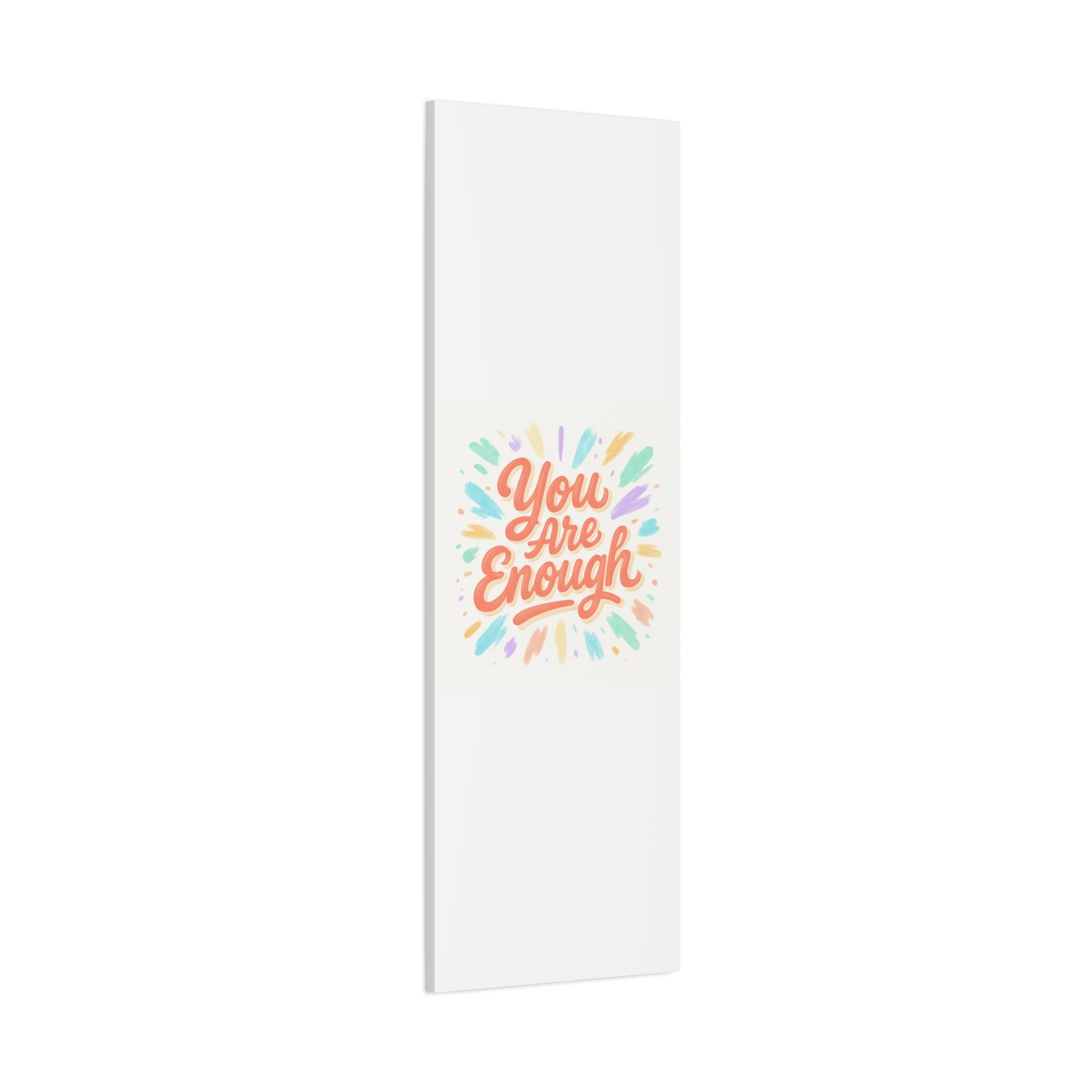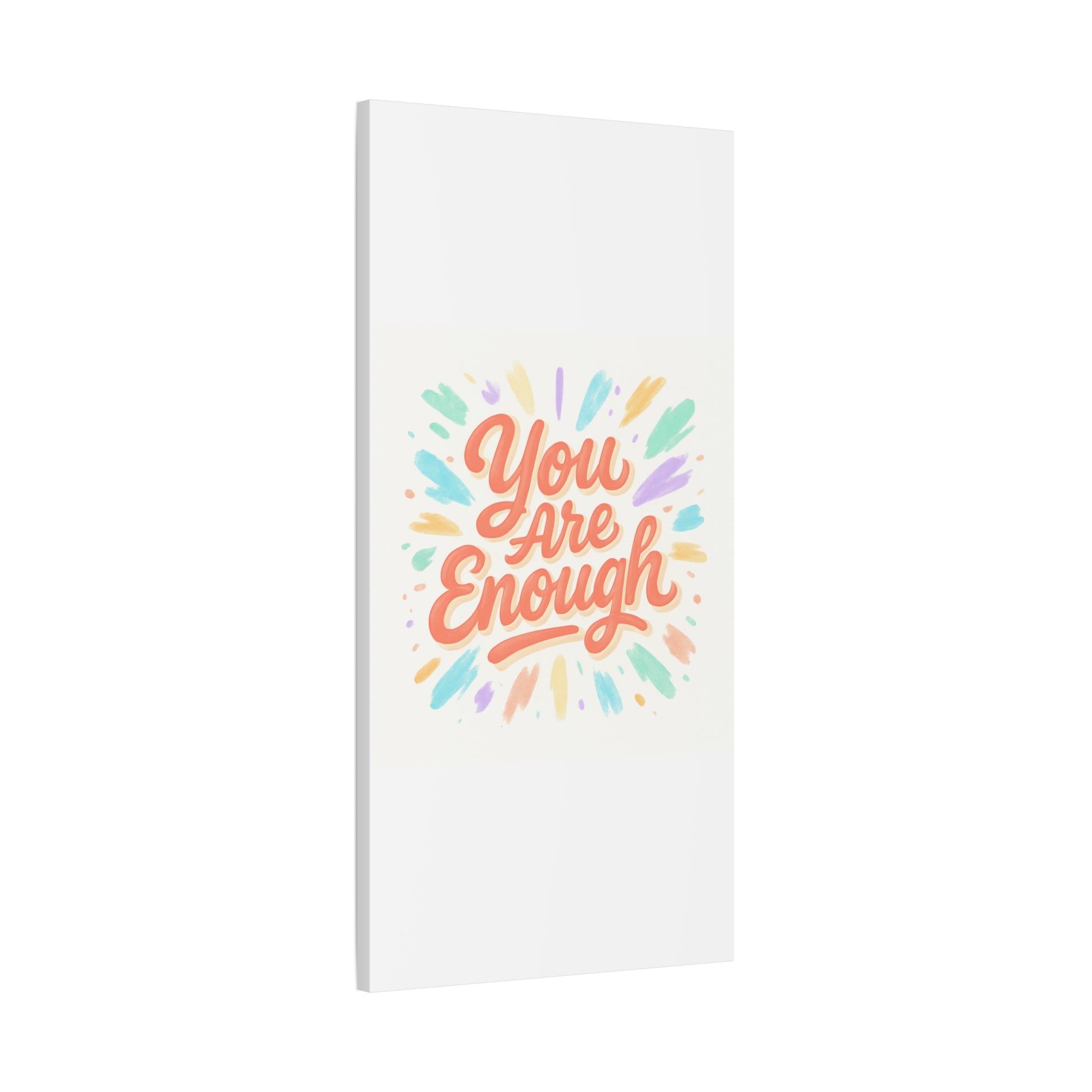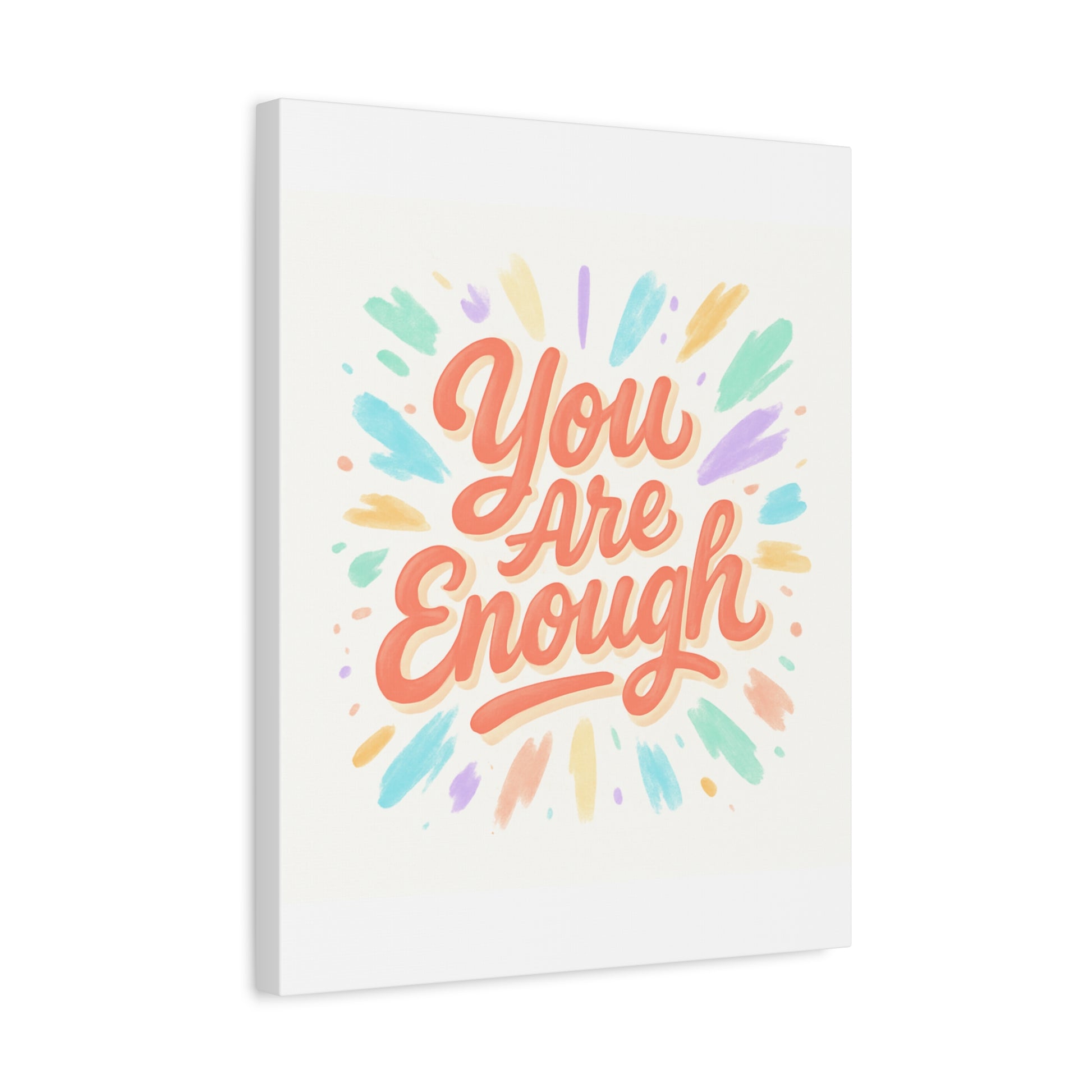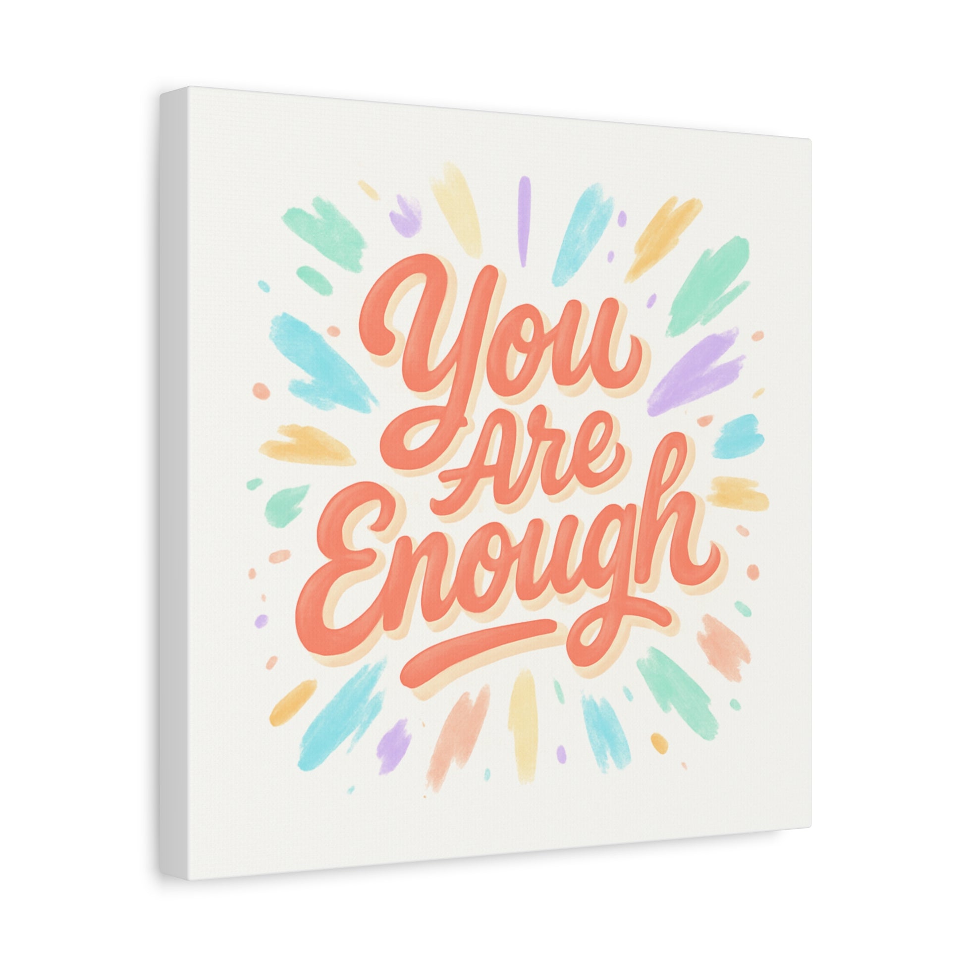 Bright, hand-lettered affirmation printed on a matte stretched canvas that brings a gentle, uplifting energy to any wall. Soft coral lettering — "You Are Enough" — radiates warmth while pastel brushstroke bursts in mint, lavender, peach, and gold add a light, painterly glow. The textured cotton-poly canvas and clean white edges give it an artisanal, gallery-ready feel that fits a cozy bedroom, home office, or calming nook. Subtle depth from the 1.25" profile makes the artwork feel present without overwhelming a space. Hang it solo for a focused statement or pair with framed photos and plants to build a quietly hopeful vignette.