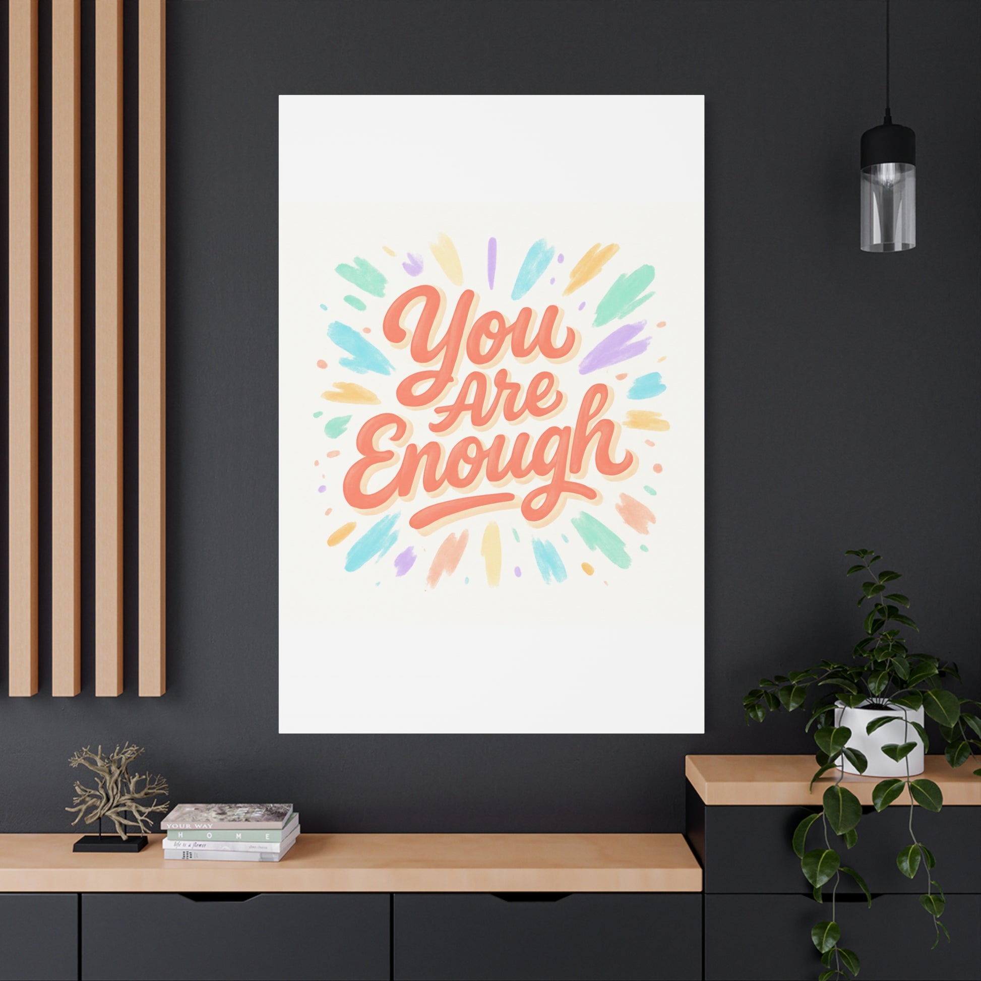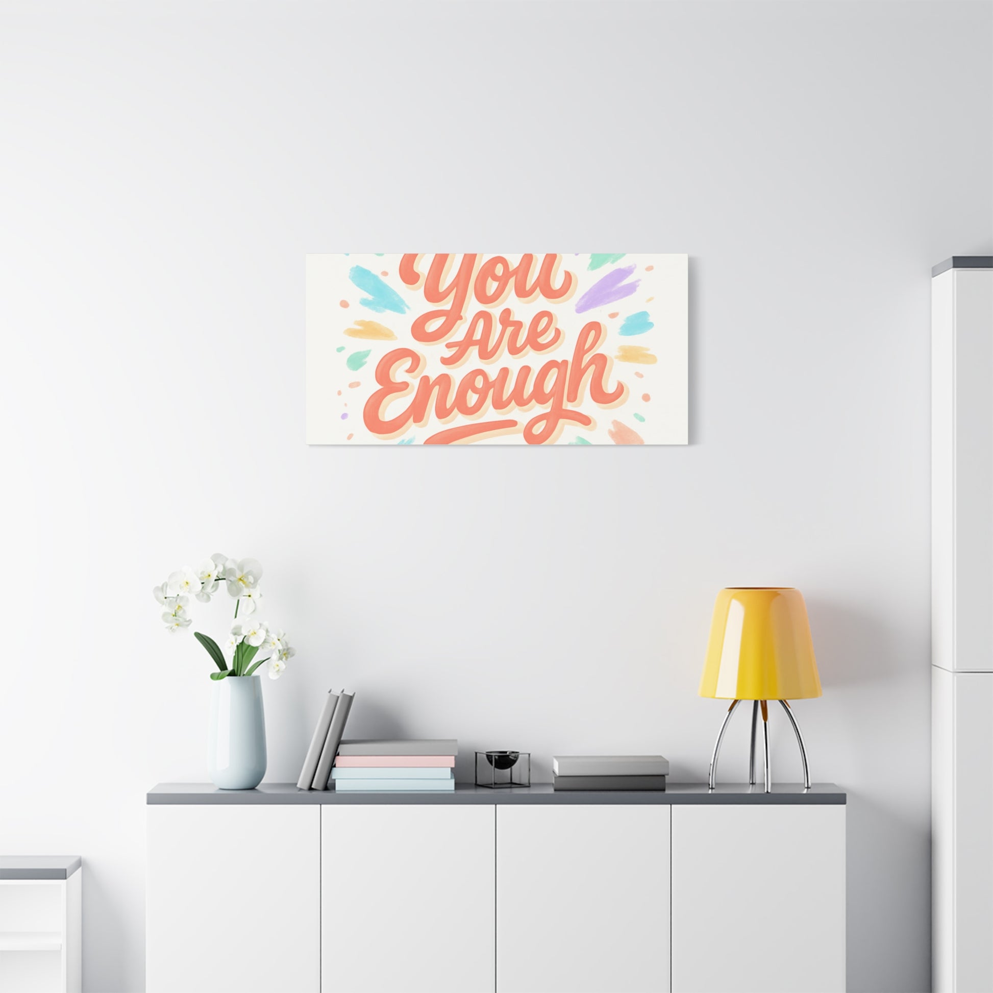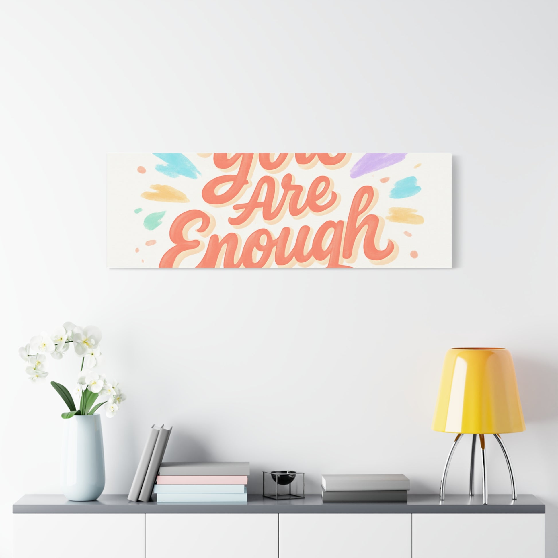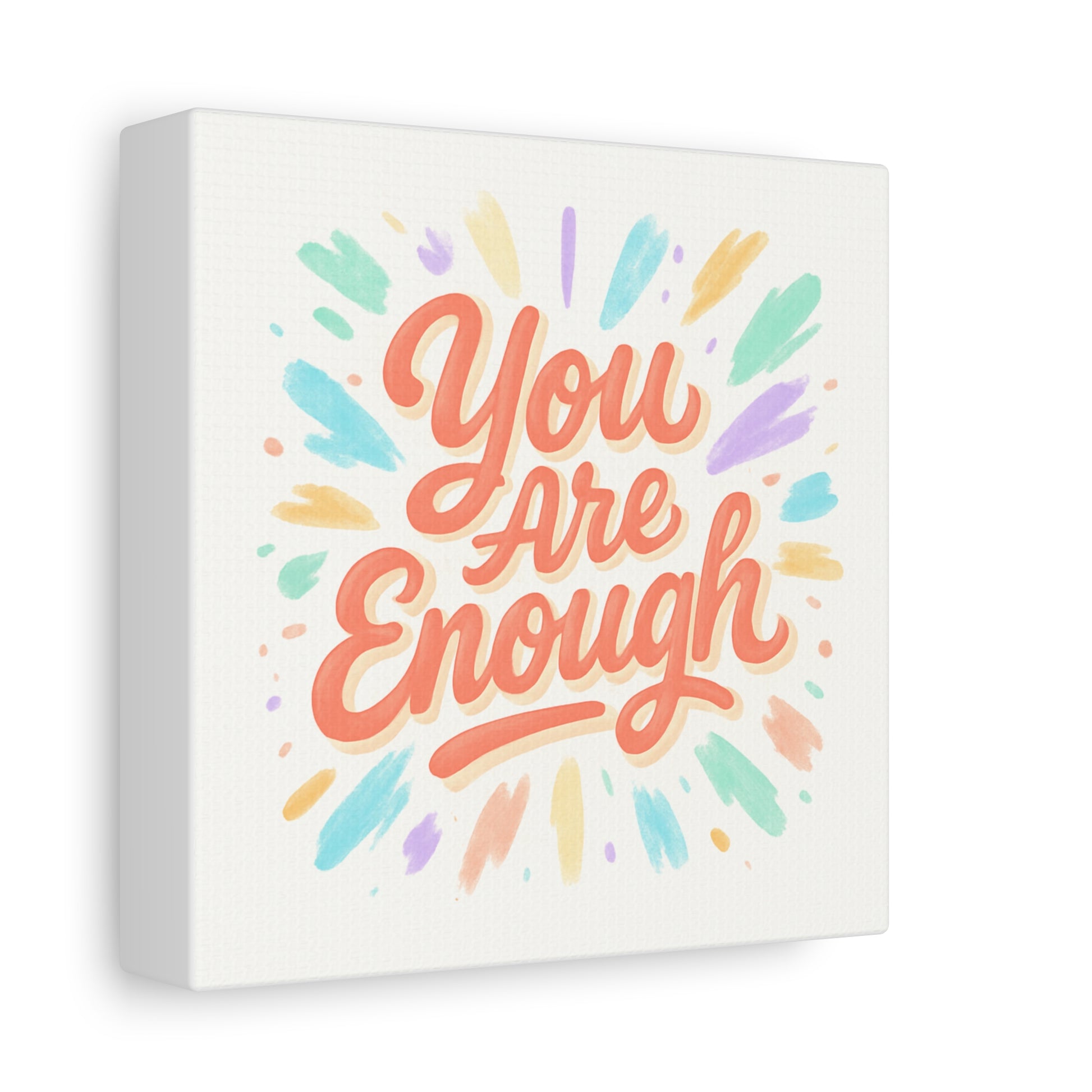 Bright, hand-lettered affirmation printed on a matte stretched canvas that brings a gentle, uplifting energy to any wall. Soft coral lettering — "You Are Enough" — radiates warmth while pastel brushstroke bursts in mint, lavender, peach, and gold add a light, painterly glow. The textured cotton-poly canvas and clean white edges give it an artisanal, gallery-ready feel that fits a cozy bedroom, home office, or calming nook. Subtle depth from the 1.25" profile makes the artwork feel present without overwhelming a space. Hang it solo for a focused statement or pair with framed photos and plants to build a quietly hopeful vignette.
